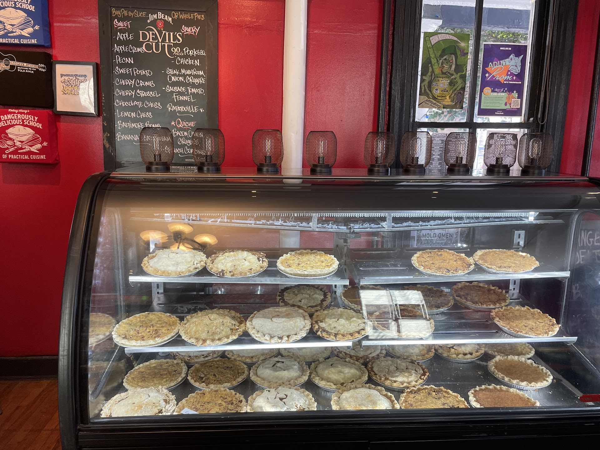 We just came back from eating here, 10/9/19 at ~7:30 PM. Here are our thoughts: We had the date night special and we ordered the SMOG and Chicken Pot Pie for savory and Cherry Crumb and Chocolate Coconut Chess pies for desert. The pies were pretty tasty, but the two savory pies were lacking salt, the cherry crumb pie was lacking sugar, and the chocolate pie had too much sugar! The portion sizes of the savory pies were pretty small. For the price of the date night special, altogether it wasn't so bad. But I'd never pay the full asking price for a small slice of pie like that. The staff have absolutely no customer service skills whatsoever. Nobody greeted us as we entered, and we watched as more than five other customers entered without being greeted. In fact, we had to wave to the employee before he got up from his chair. We ordered our savory pies first and then went back up to order our sweet pies afterward. We also ordered our drinks when we ordered our sweet pies. When we told the girl employee that was our plan, she gave us a death stare and didn't say anything! Then, she proceeded to have an audible argument with the guy employee. The lack of customer service skills was actually laughable! This business is not at all environmentally conscious! Every single piece of pie is first warmed up on a paper plate, which is thrown away, and then is brought out in an aluminum container. There is no recycling bin, so you're forced to throw away your perfectly recyclable glass bottles and aluminum containers! What a shame! We brought our aluminum containers and another customers glass bottles home with us to recycle. This business generates a huge amount of unnecessary landfill waste! What's so hard about getting a recycling bin? When we asked the employee, he said they're "trying to convince their boss to get a recycling bin." Why should the boss need to be convinced of this? It costs little to nothing extra for the business and saves the environment! The only side dish available was a sad excuse for a salad.