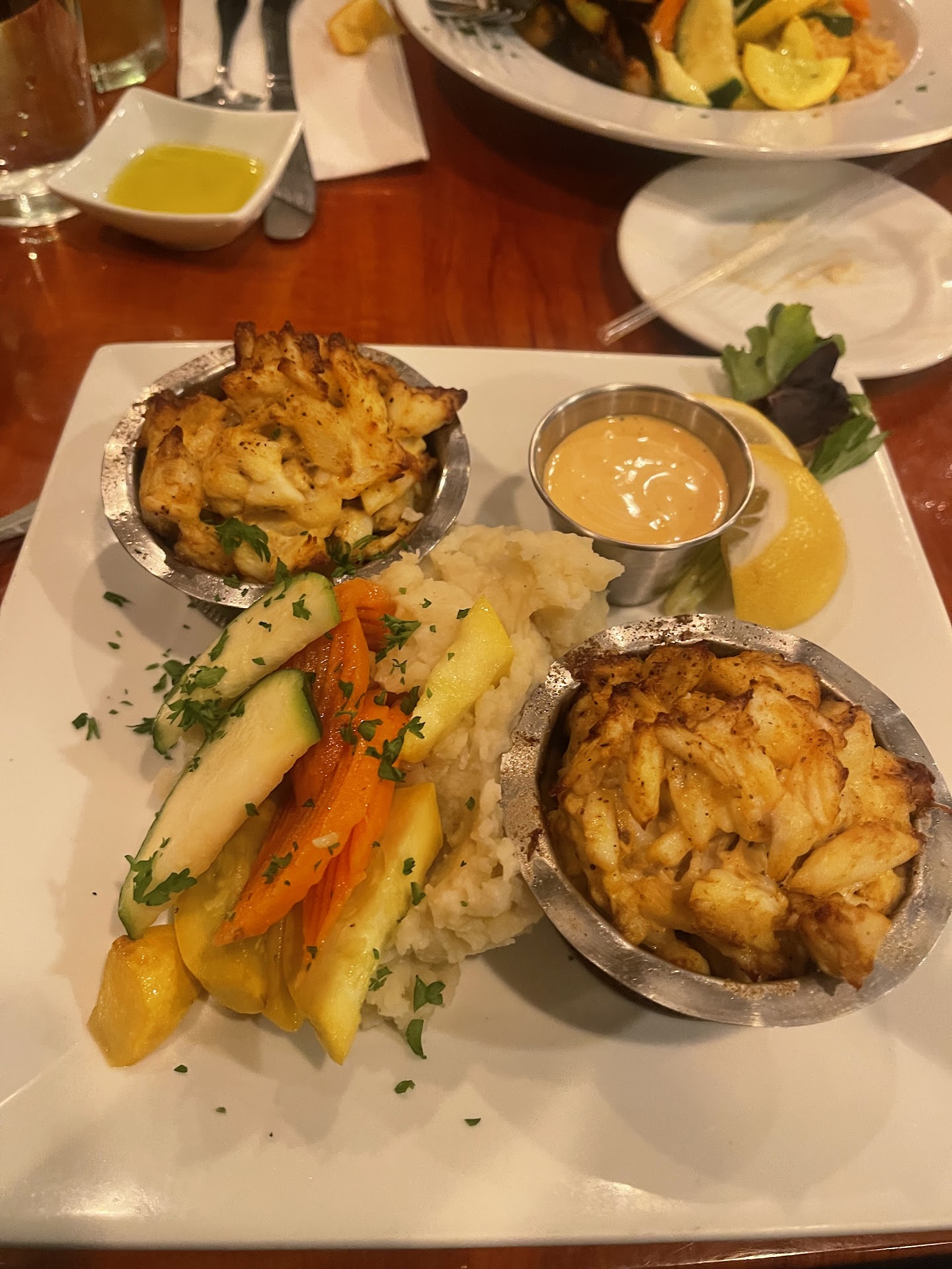I didn't have the cucumber salad, but I did have some of the Mom's Crab Cakes, which my friends ordered. They were not like traditional crab cakes, because the crab cakes had no filler at all. It was everything crab, which made it more worth it, which also meant that it was expensive because it was between $40 and $50 when we got it. Once again, a good amount of vegetables, and a good amount of mashed potatoes. I enjoyed it a lot as well, even if part of me wasn't really used to it.