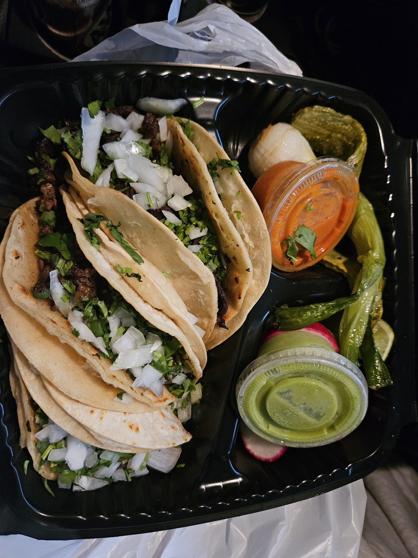 On Cinco de Mayo I had a late night craving for some AUTHENTIC street tacos post gym workout. With all the local spots I had planned on going to either being closed or their kitchens being closed, I landed at Guacamole. It was about 9:45 pm, but the clerk told me I could still order as long as I did carry out. I was grateful. I placed my order, and about 15 minutes later, I received my street tacos. Three tacos with carne asda, onions, cilantro, 3 lime wedges, radishes, cactus, a bulb onion with a red and green sauce on perfectly toasted double flour tortillas. I promise they were perfectly seasoned, hot, delicious and just the way I like them! Street tacos are usually a hit or miss for me, but this was definitely a hit!