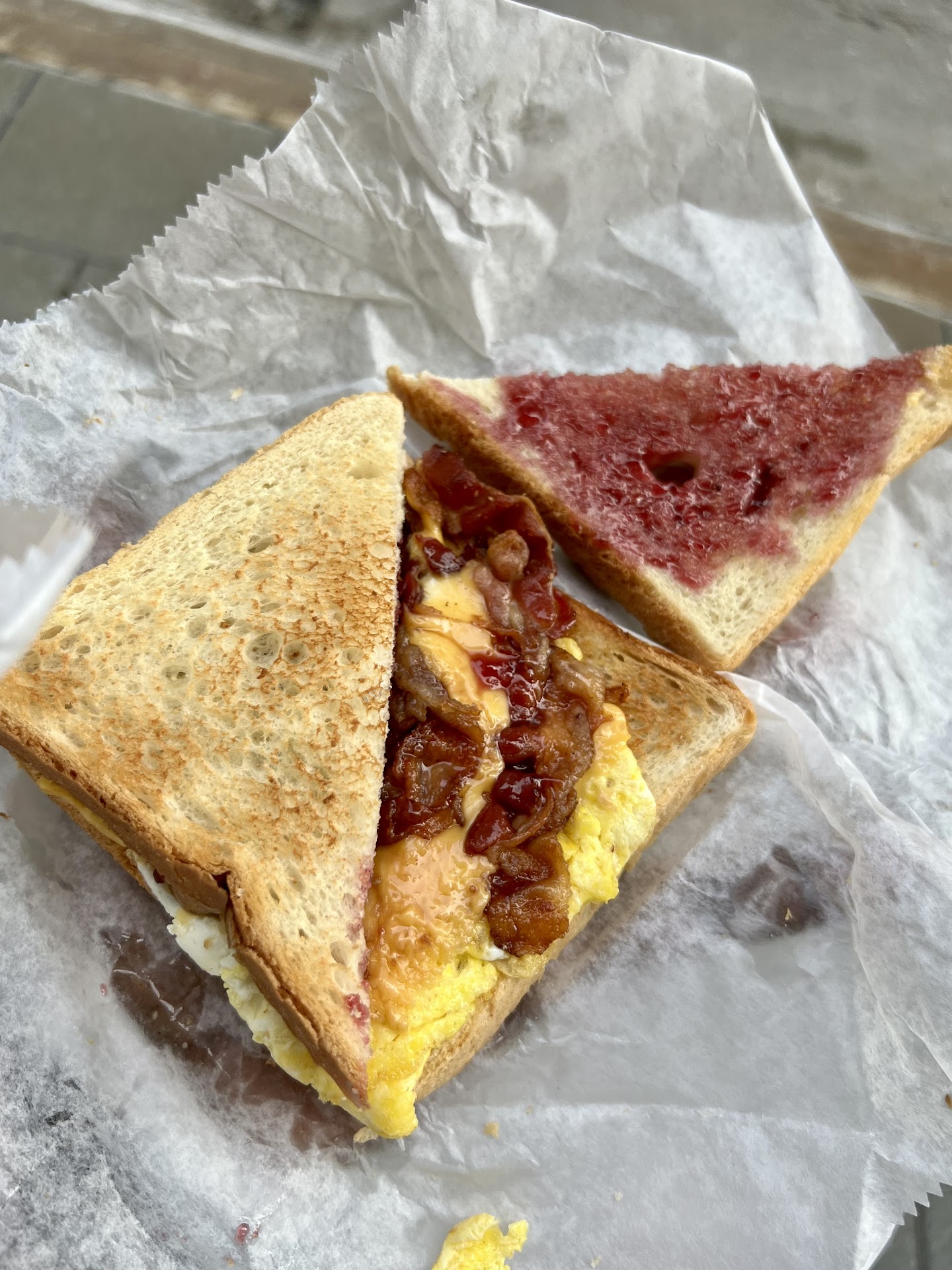 As you will see from the photo, the bacon is not well done. The bread had more crunch than the bacon. There was jelly, thank you; I also tasted some butter, thank you. The eggs and cheese were uninspired.