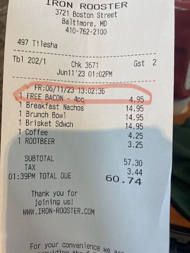 When I walked into the restaurant, I had to wait at the hostess table with 3 employees behind it for them to finish their conversation. Not a big deal, only a moment or two of waiting before I was acknowledged while one server tried unwelcomely to hit on another. I placed my name down for the 30 minute wait and received a text that my table was ready in a timely manner. When I got back to the restaurant to be seated, I had to wait again to be acknowledged while a server and the manager had an argument about seating. Again, not too big an issue, but something worth noting. Once we got seated, it took several minutes for our server to look at us, let alone ask what we would like to drink. She walked past us several times while obviously avoiding eye contact before she finally asked what we would like to drink. When she came I asked about the "Free Bacon" they had on their menu for following them on social media and she gave me a nod and walked away almost as soon as I brought it up, I did not mention it again and never received any bacon. I ordered the breakfast nachos which arrived stale and room temperature with cold eggs. I then ordered the brunch bowl which was also disappointing, but I could only eat a few bites before I started feeling nauseous from the nachos. After watching the server avoid eye contact again for a considerable amount of time I finally got the check and was appalled to see I was charged $4.95 FOR FREE BACON. I NEVER got any bacon. I NEVER asked for any bacon. Also, who in their right mind would program the computer to have a button that charged ANYTHING for FREE bacon??? What is the point of that? I am baffled that it was even possible to read on a receipt "1 FREE Bacon .... $4.95"