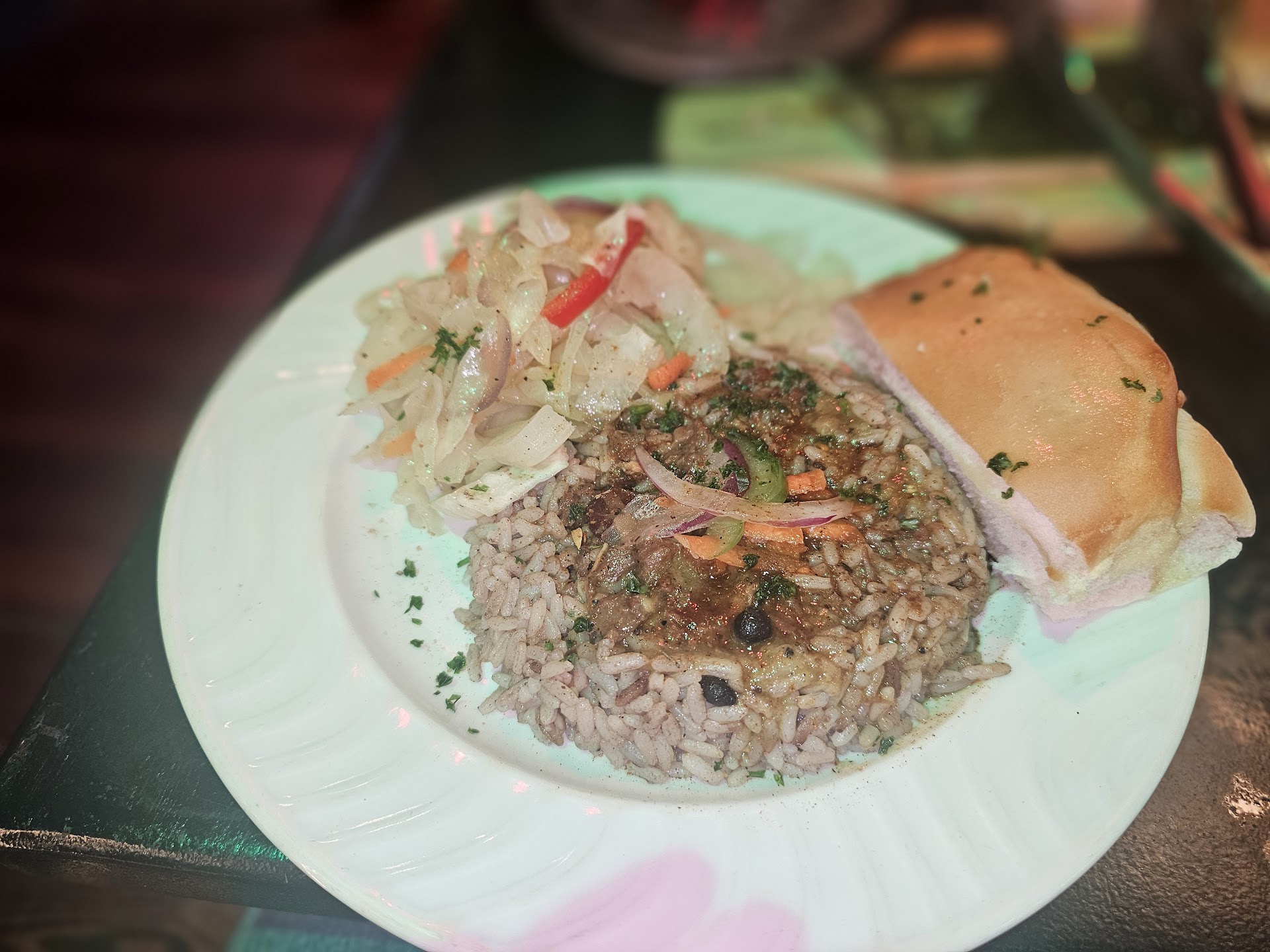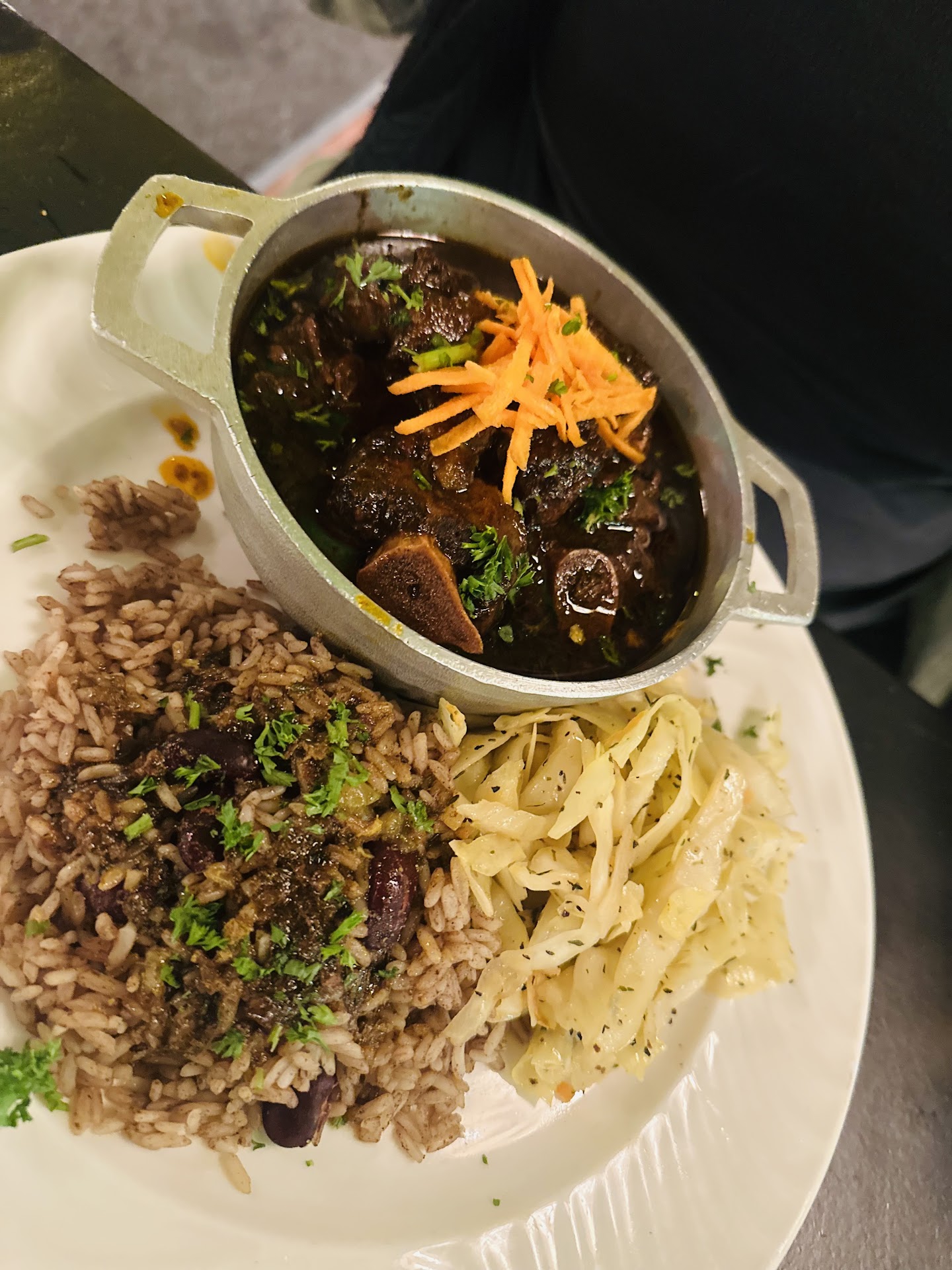 The cocoa bread felt like regular bread to me, but perhaps thatâs due to my taste buds being overwhelmed by all the flavors we were trying. For my main course, I opted for salmon, rice and peas, and cabbage. Unfortunately, the cabbage was a bit hard and lacked flavor, while the rice was undercooked and not as vibrant as one would expect from a Caribbean restaurant. My wife had the oxtail, which was tender and flavorful, but it couldnât quite redeem the rice and cabbage.