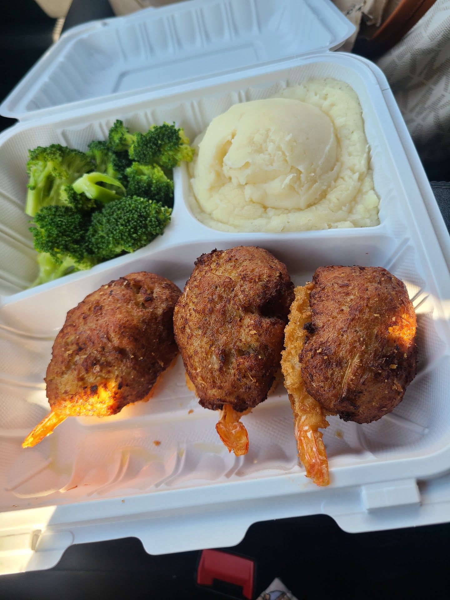Was at work around the corner and a colleague suggested i go here. Checked the ratings which seemed decent. Ordered thr stuffed shrimp with broccoli and mashed potatoes no gravy. I was disappointed with the food. Yes it looked great, but the taste was something else. Mashed potatoes were not homemade. You can taste the potato flake, rather more like cardboard that had a whole container of salt in it. It would've been bearable if it was seasoned correctly. Because I didn't get gravy i thought i would've got some butter on the side or something...nope. Them the stuffed shrimp weren't fresh. It was breaded with "crabmeat" on top that had been broiled. I gave it a try and there was a lot of filler and that was a little too salty for me as well. The only thing i enjoyed was the broccoli. It was crisp and seasoned just right. Also the cocktail sauce was salty too. Whoever cooked this day was heavy handed with the salt. The food looked ok when it was showed before putting in a bag to go. I don't understand how they have 4.5 stars. Maybe people like salty greasy foid. The bread was an oily warmed up ha.burger bun 😕. Initially i thougyy it was a warm biscuit or roll. This place has some work to do. Would I go back...maybe for fries...
