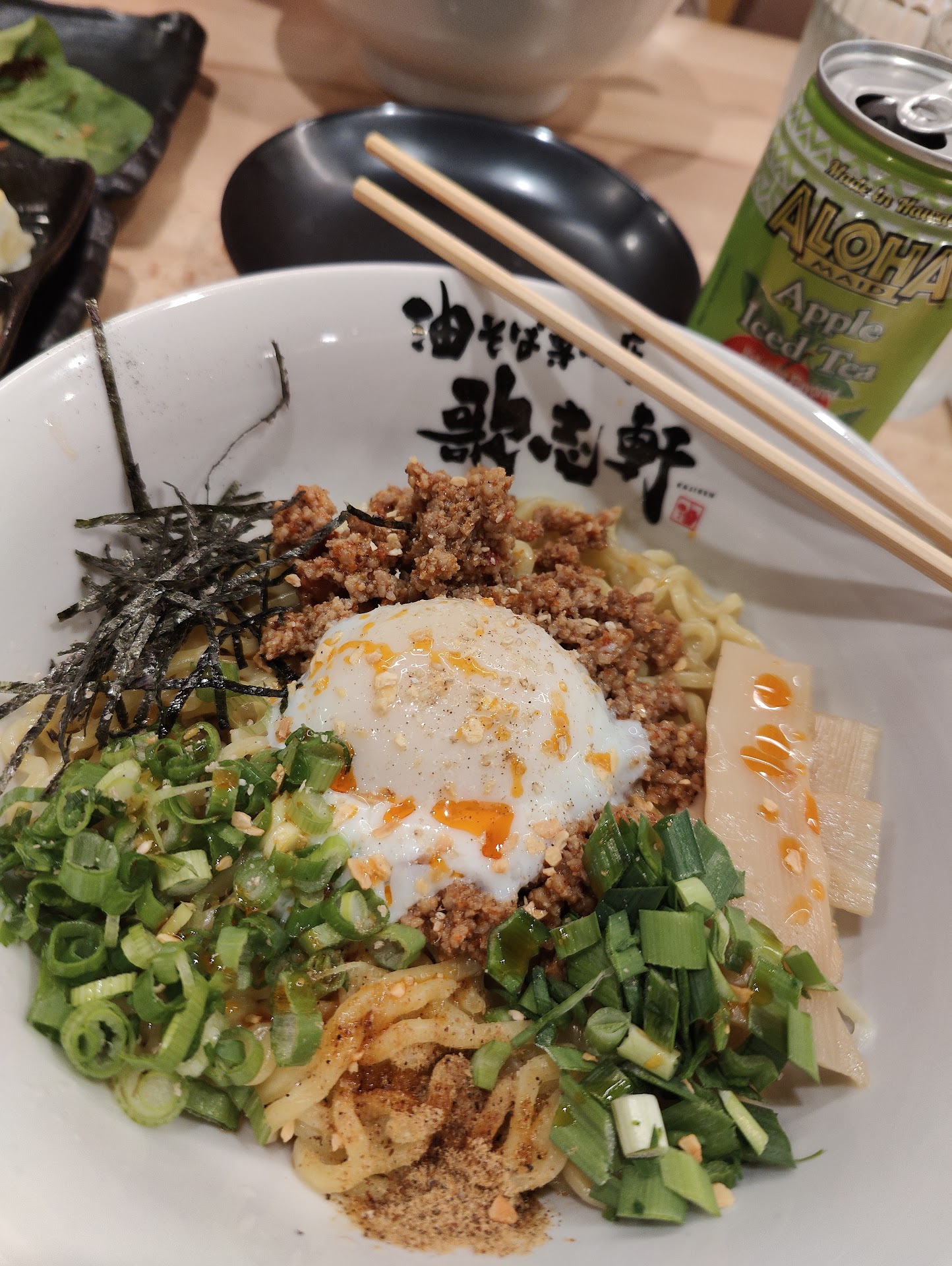 The original aburasoba was great. It has thick noodles which have a good texture, and the flavor is good. I would definitely choose the tonkotsu shoyu ramen over this, but this is also a very solid option. I like that it's not too rich unlike some similar dishes I've had before.