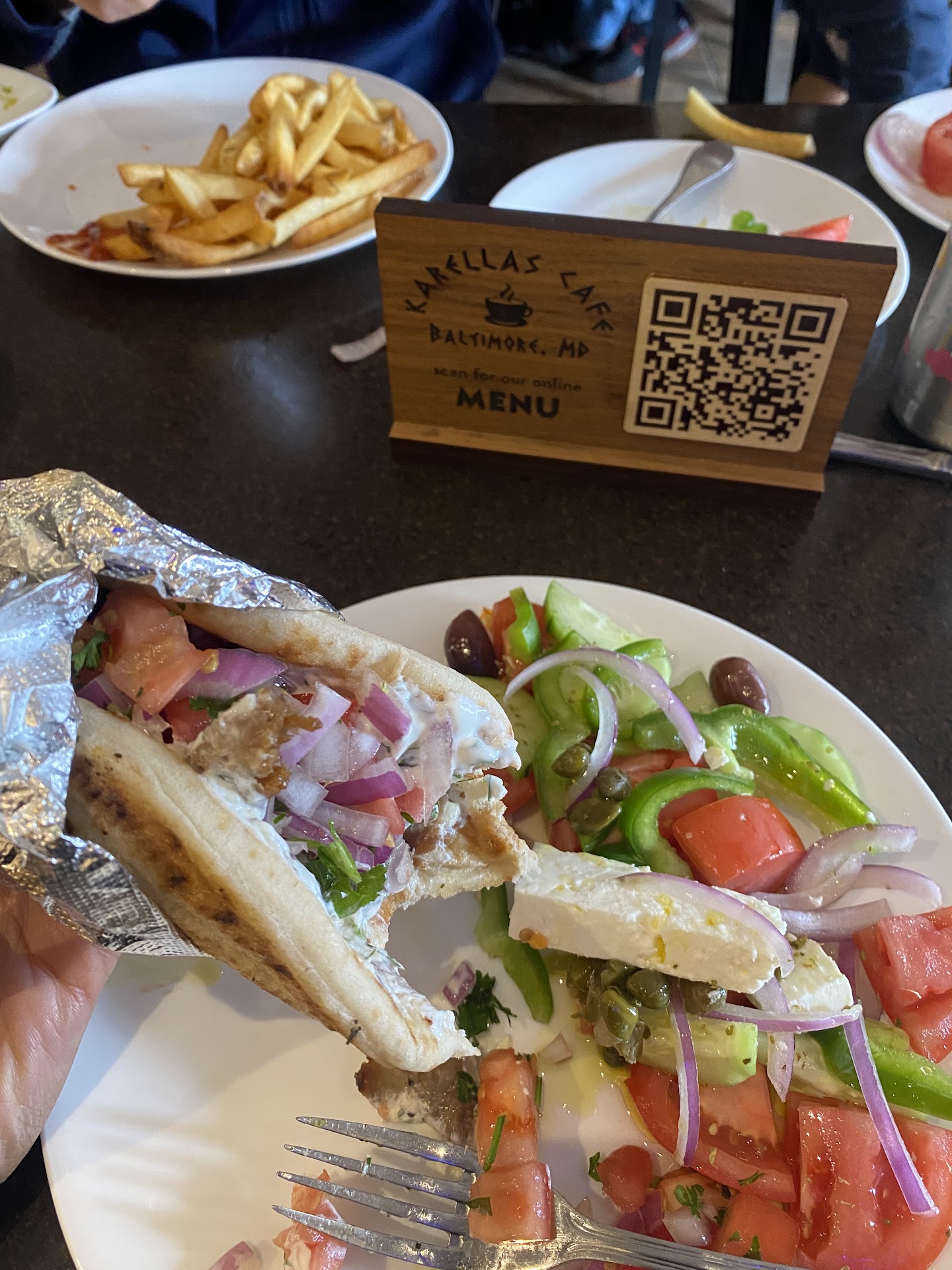 Vibe: 5/5. Tucked away on a narrow side street in Greektown, Karella's is a small restaurant that offers 2-4 person dining both indoors and out. Inside, the restaurant has a hand full of 2 top tables (can be pushed together for a 4 person group) making this a perfect date night spot. Outside there is 1 large 4 top that could squeeze up to 6 people if needed. When you walk inside, the sounds of Greek folk music paired with the Mediterranean decor are nice touches that add to the ambiance. The small kitchen is located at the rear of the restaurant which can be seen from the dining room. Karella's is setup as a counter service cafe, with a display case and beverage cooler at the main counter in the rear, but during our dinner we ordered/served at our table.