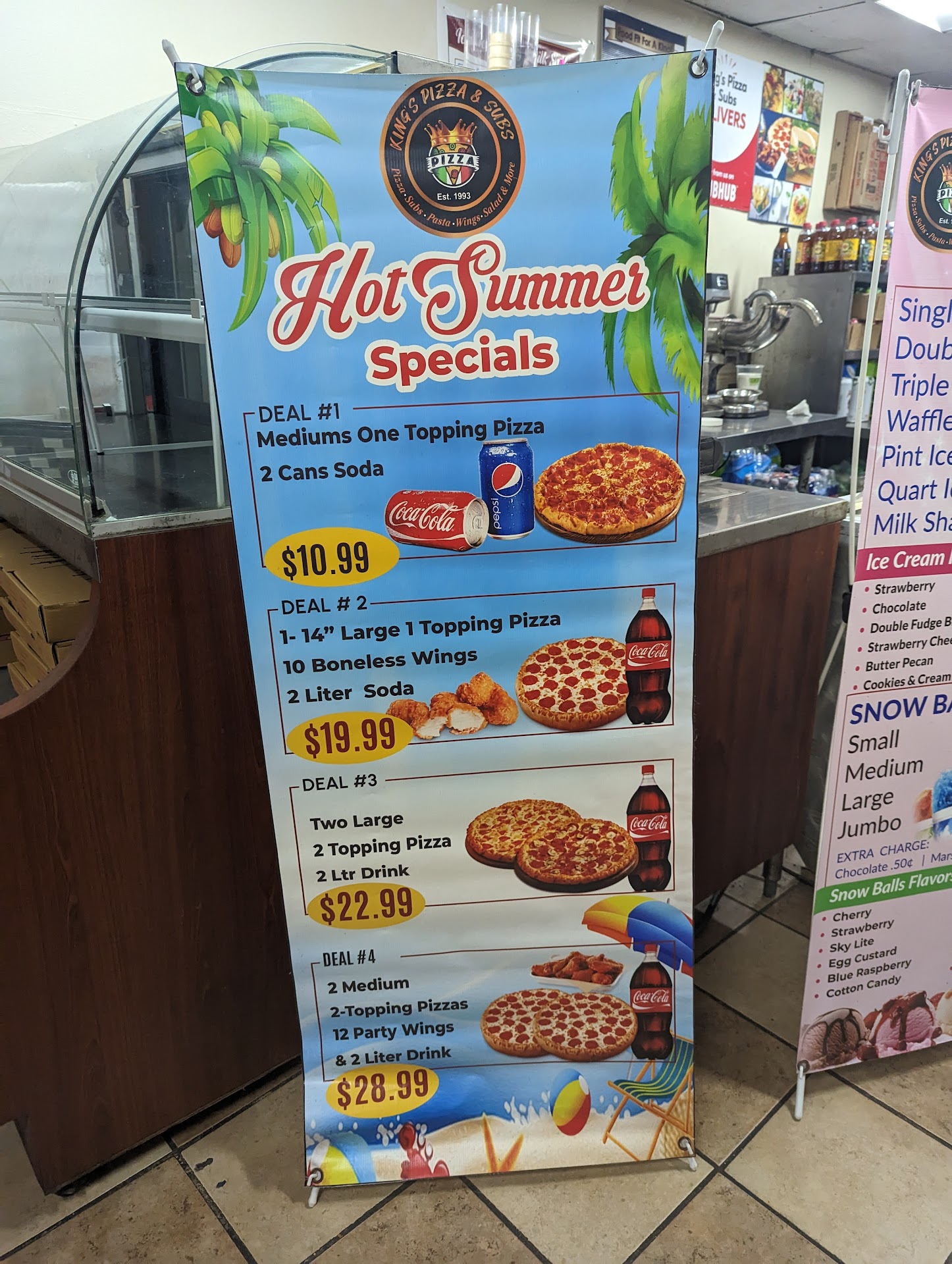 This was literally the best pizza Iāve had in a very long time. Stephanie the manager was so kind and professional when I called with questions because this was my first time ordering from Kings. The wings were a nice size and flavorful. The cheesesteak sub was incredible. All the ingredients are fresh and delicious. Thank you Stephanie for such an amazing experience. This is now my go to pizza...