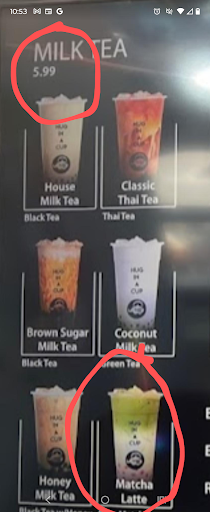 Read moreI ordered a Matcha Latte from the menu of Milk Tea - $5.99. The cashier asked me if I wanted Boba, and I said, "Of course! I want it as pictured." He charged $.75 for Boba making the drink $7.12. I didn't want it, because I was opposed to the add on charge when the photo on the menu shows that the Matcha Latte comes with Boba for $5.99. Maybe take new photos that show what you'll get for $5.99, a boba-less Milk Tea. The Menu is deceptive; why not put $6.74 in place of $5.99? Who likes to be bamboozled at the...