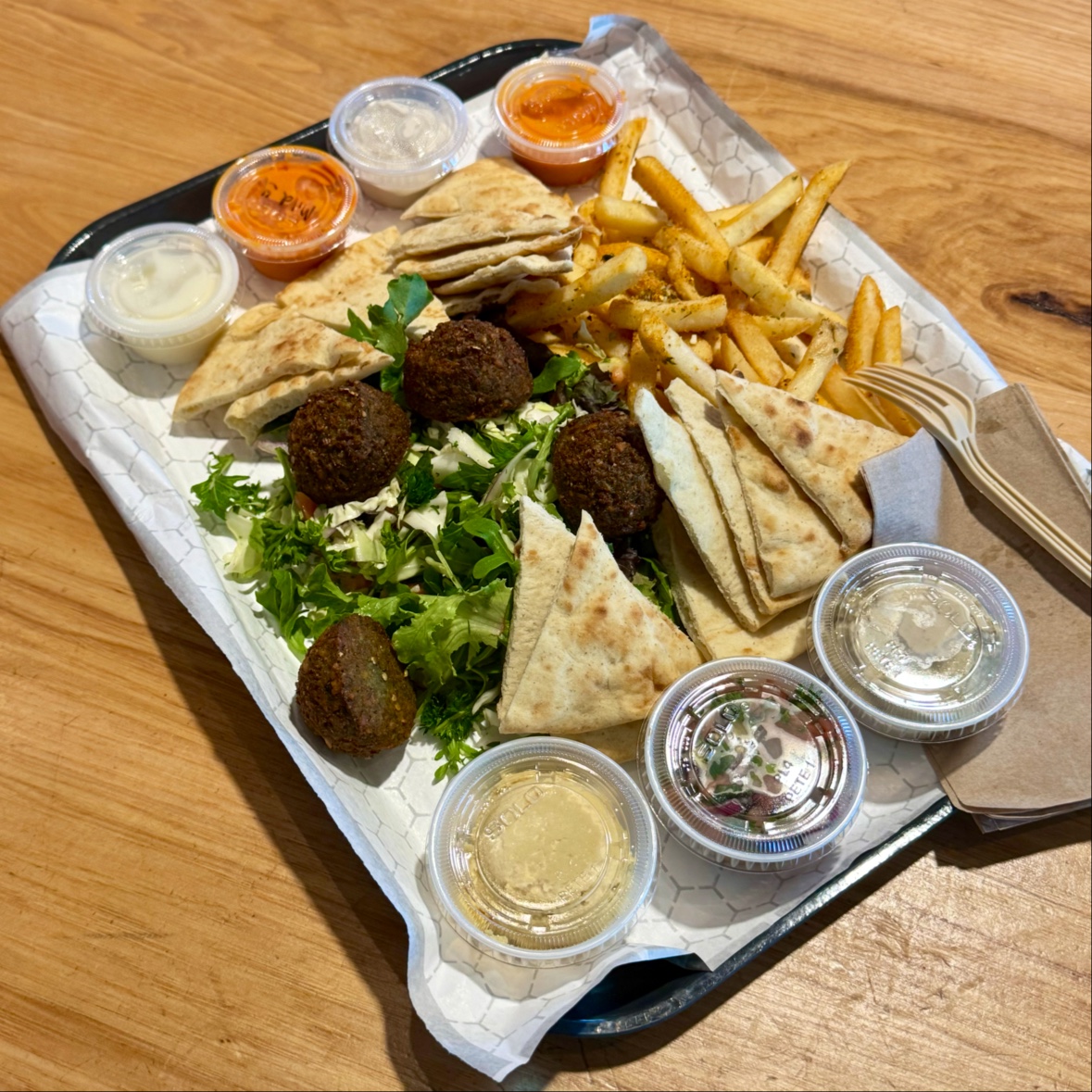 The falafel was definitely the highlight—crispy, well-seasoned, and especially tasty with the garlic sauce and tabouli. The tabouli was fresh and flavorful, easily the best of the sauces. The garlic sauce had an unusual appearance, while the hummus lacked the expected creaminess.
