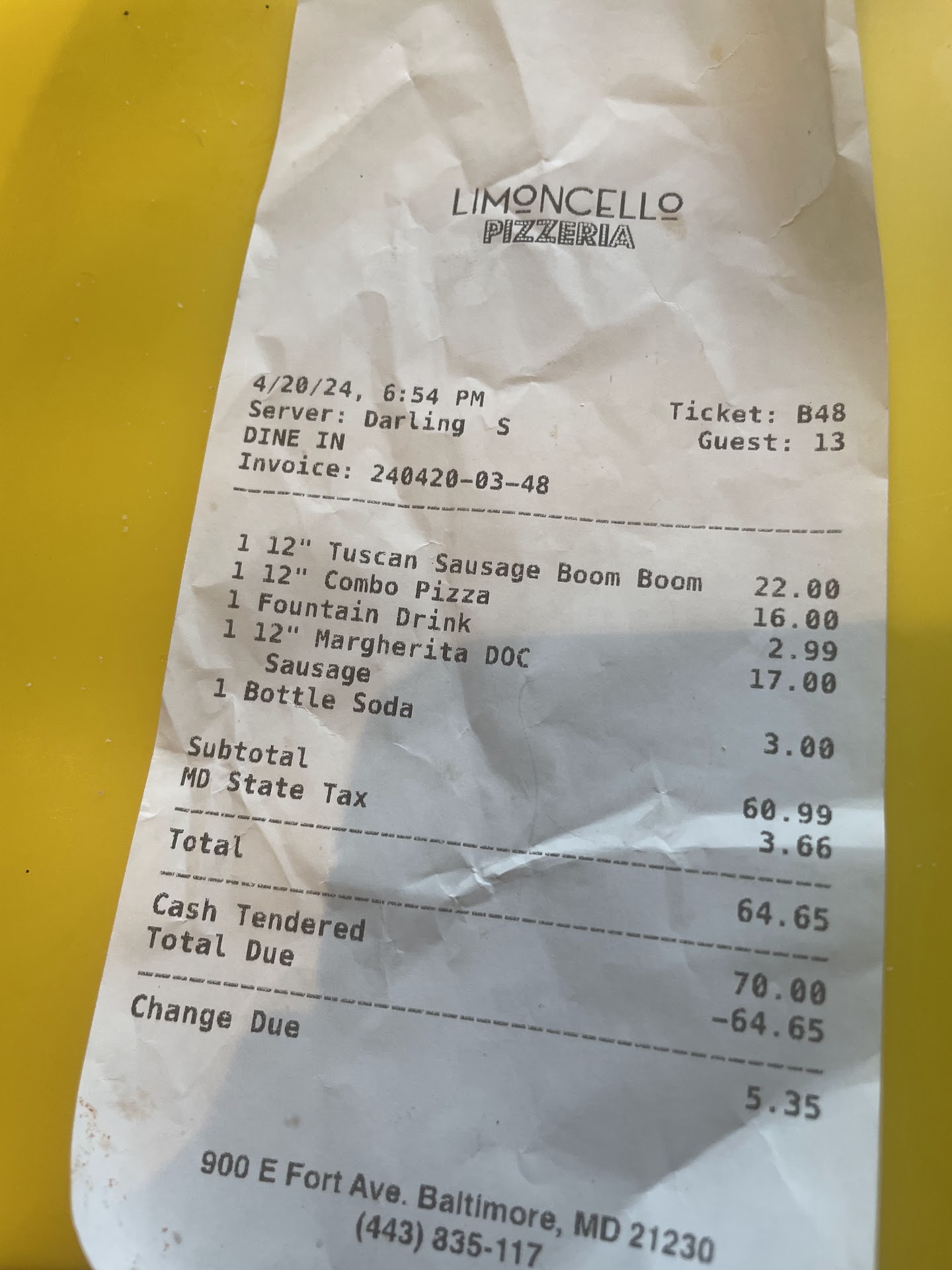 To be fair, the pizza itself is decent for the area (I’m originally from New Jersey, so I have high standards). But between the repeated order issues, unreliable delivery, and declining service, we can no longer recommend Limencello. There are too many better options nearby that offer better service and value.