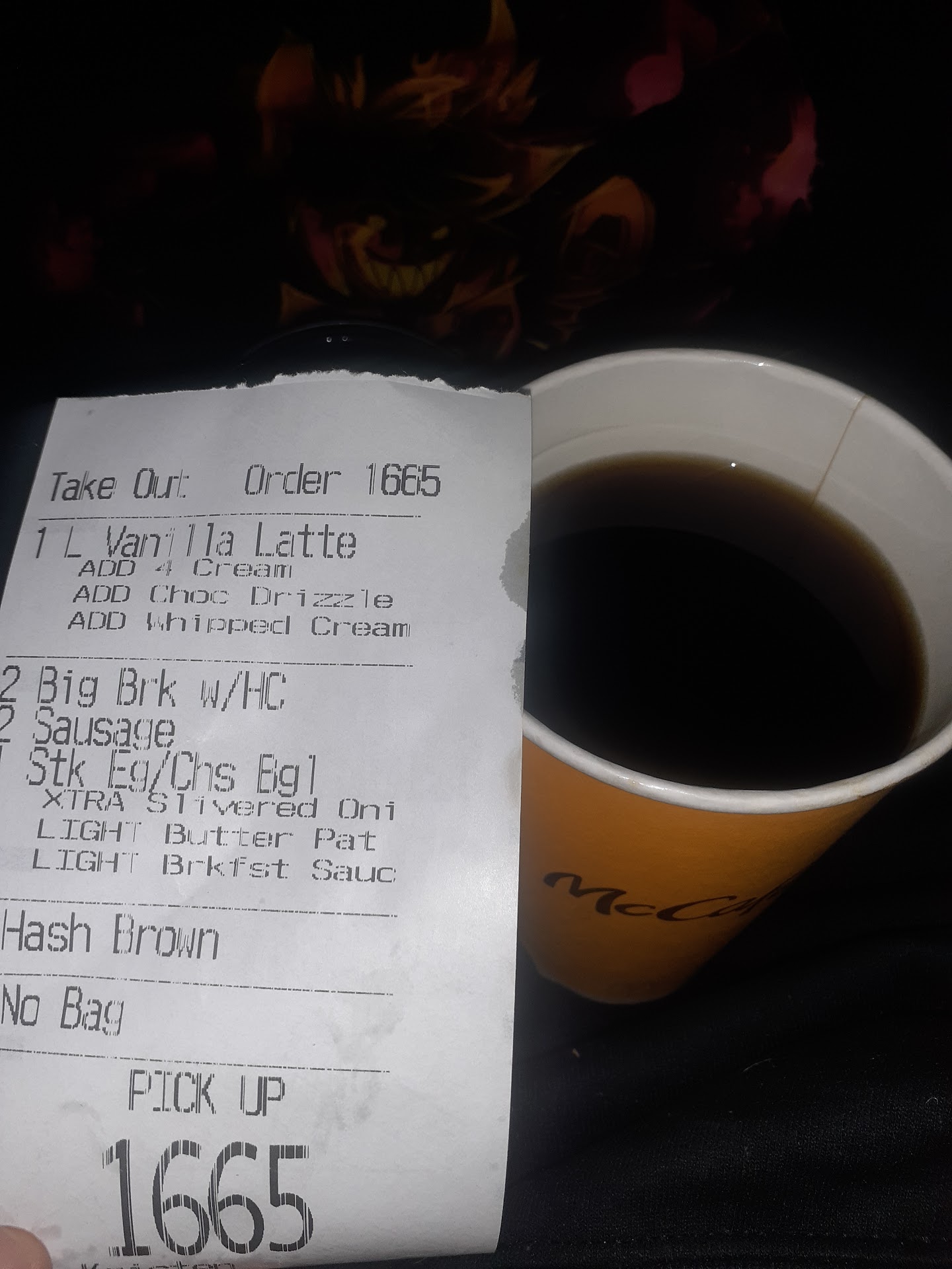 And My Experience At THIS Particular McDonalds....Was....Meh....Fine. The Big Breakfasts for my little one to have for today and tomorrow were Good....But the Hashbrowns And my Steak, Egg and Cheese Begal were extreamly greasy. Furthermore the main reason this review is being written I ordered a Vanilla Latte, With 4 Creams, Whipped Cream and Chocolate drizzle as my own special treat to myself. What I was given was a cup of Black Coffee. No cream. No sugar. Nothing. ((The First Photo.))
