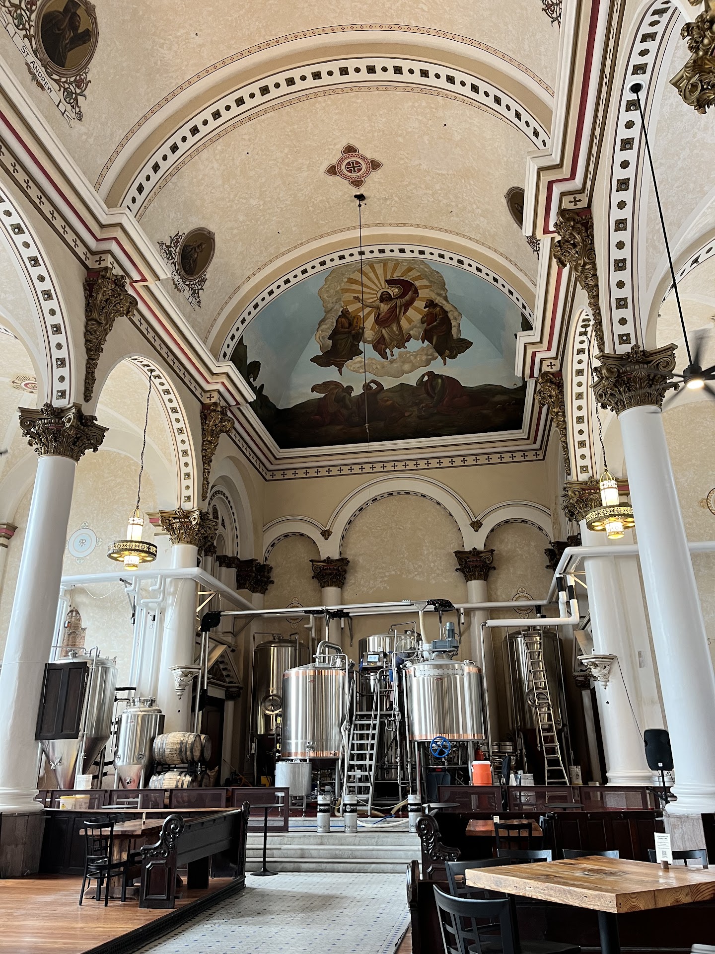 Read moreCame here on a Saturday night for drinks. We brought in outside food, but they do have food trucks too. I got a 1/2 cider and 1/2 beer drink, which was really good. Growing up Catholic, at first it was weird to walk into a church and see it as a brewery. The main area of the brewery is stunning -- you walk in and see the pillars and the painted ceilings and old school ornate decor. It's obvious that the owners have taken a lot of care to renovate the space while also preserving the history of it. A lot of the original fixtures of the church (the ceiling artwork, the confessional, the church organ, church pews, etc) are all still present. They have pictures hanging up that show the renovation work that was done and what the church looked like before. It was really cool to see a historical space being preserved and used as a community gathering space, rather than being torn down and turned into an empty lot. In terms of the service --The bartenders were friendly and were able to recommend drinks. There was also plenty of seating (there's so much seating that even with 60-some people in there it didn't feel crowded). They did also have board games available for people to play, which some of the tables were doing. This was a really cool space to check out and we'll...
