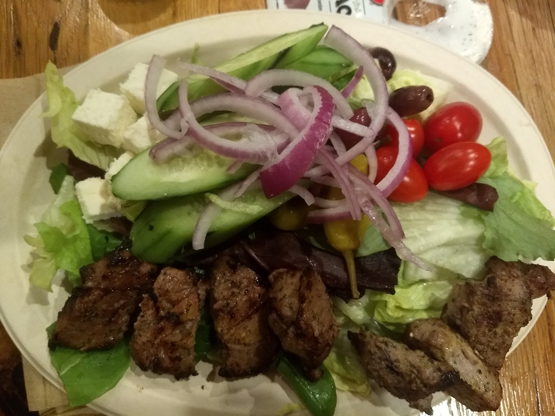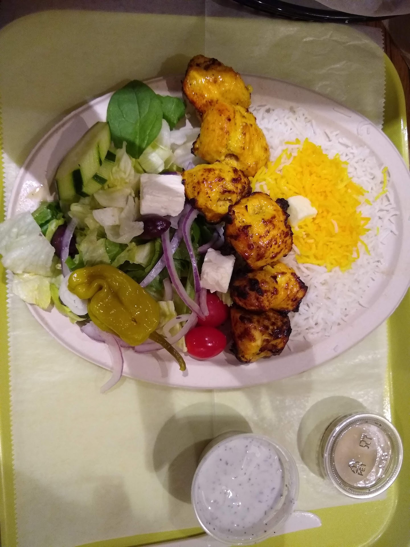 The chicken was tender, juicy, and delicious. Beautifully seasoned. I only wish it came with a slice of lemon. It went well with the cool tzatziki sauce they provided.
