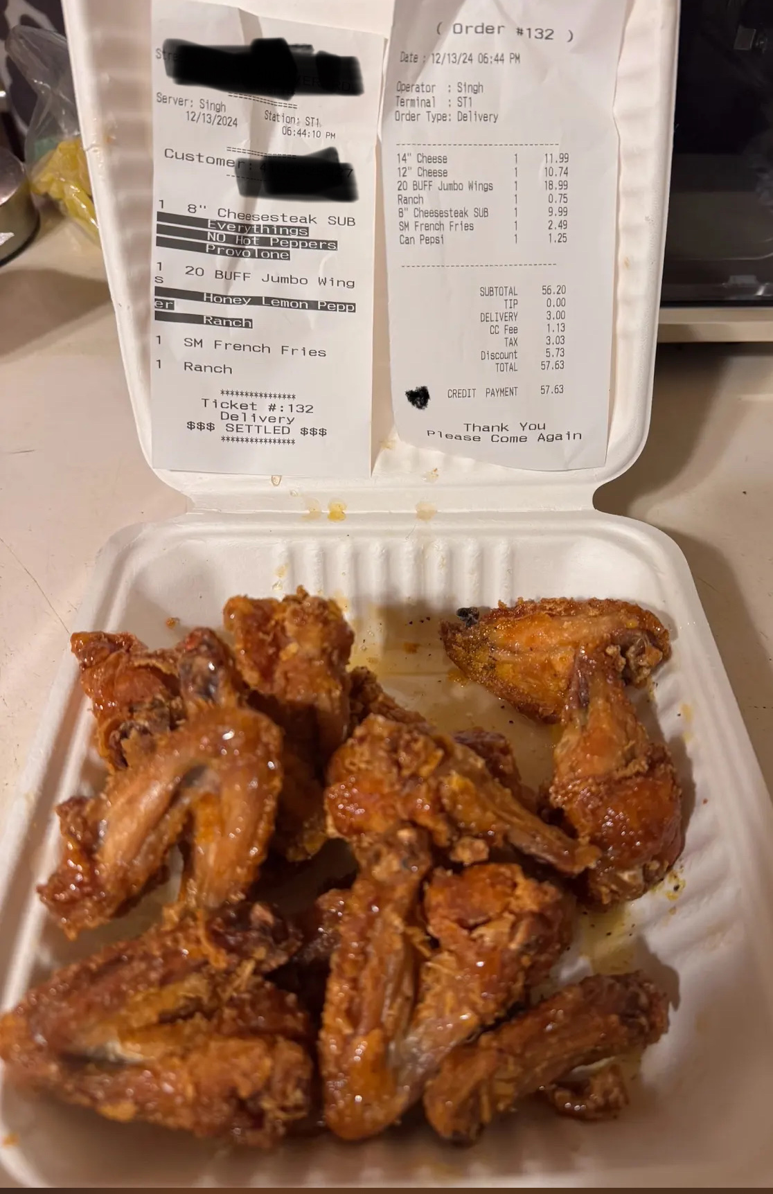 Do NOT order from this place, I repeat do NOT. First of all the food took over an hour to get to me, then the delivery driver (for their store) arrives and he calls upon arrival, I’m speaking to him telling him he’s going to the wrong house as I’m watching him head towards my neighbor’s house, he completely ignores me talking to him on the phone, then I receive the food and he hands me a receipt showing me what “I owe him” even though I had already paid on doordash, the guy had looked drunk and lost and looked as if it was his first day on the job. He then calls his store manager only for him to tell him what I told him🤦🏽♂️ then as I’m opening the food I noticed the food was very cold and soggy and I see that I received the wrong food, I had ordered wings and received chicken nuggets and ordered carrot cake and got cheesecake instead, then I proceeded to call the store and tell them about the situation and the manager then picks up and tells me that the delivery guy gave me the wrong food💀 the manager then tells me to close the chicken nuggets and pack it back up for the delivery guy to take to the right customer which is very crazy to me and then tells me that they are going to send me wings which will probably take another hour to come, moral of the story DO NOTTT ORDER FROM THIS...