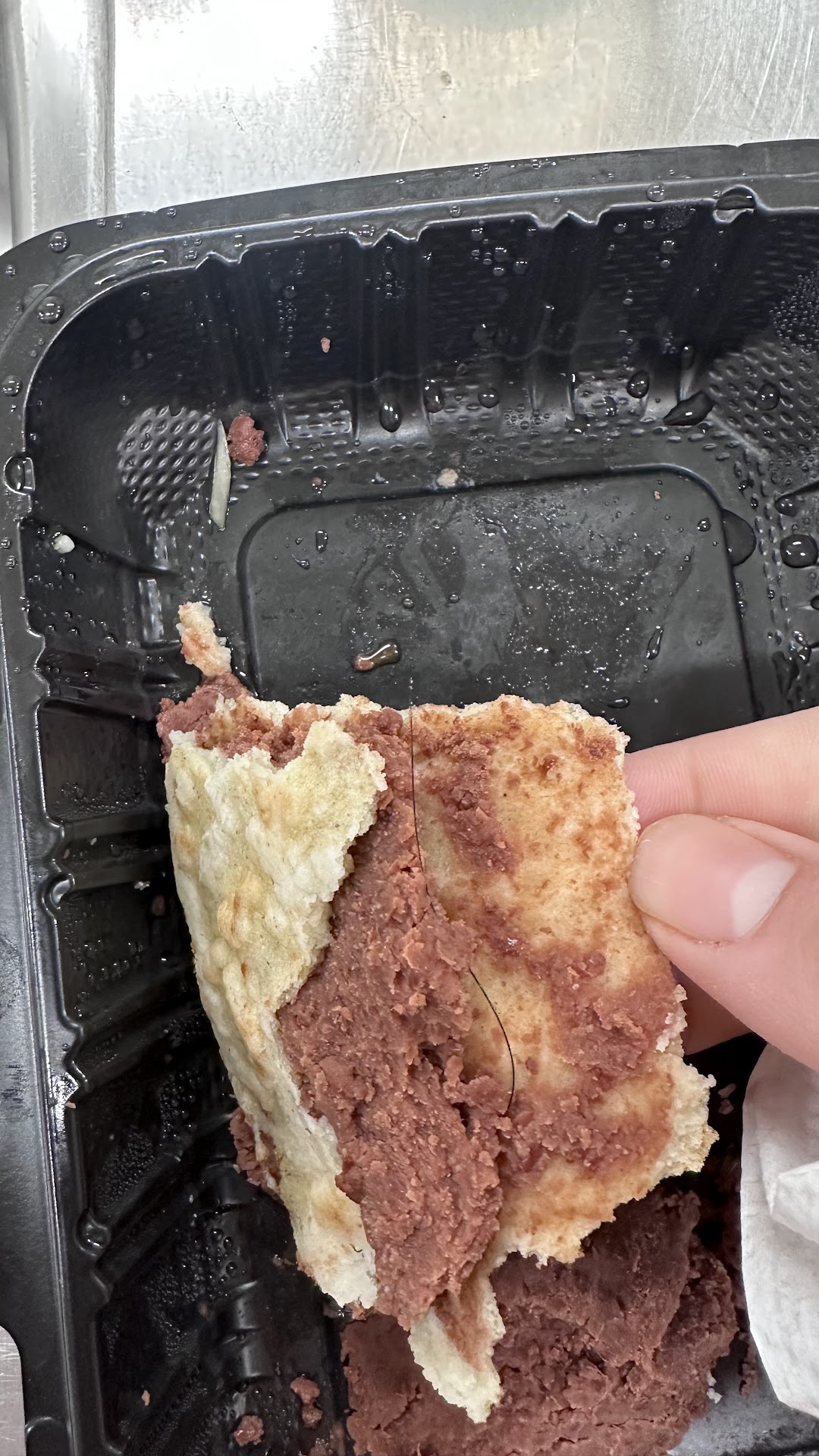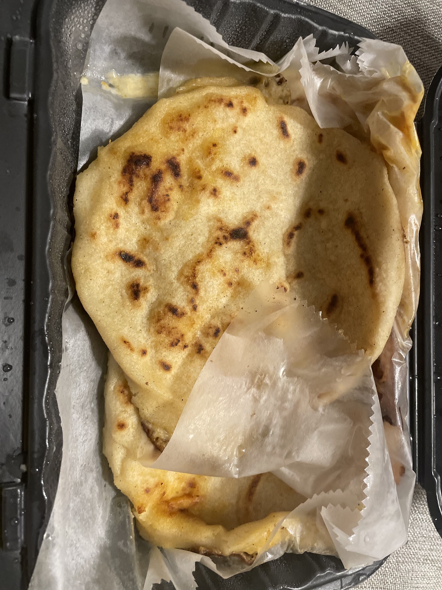 We ordered pupusa loca which is a fried corn cake pan fried and filled with beans, pork, chicken, and cheese with sub edible flour.