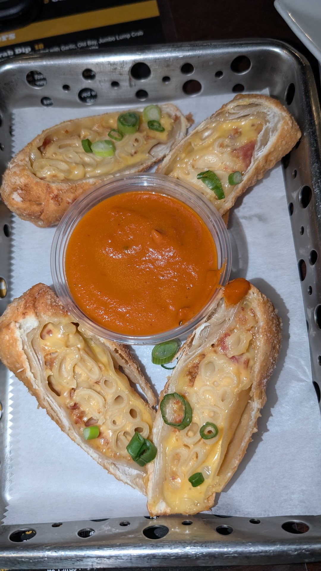 We went at 4 pm on a Tuesday. The nachos were an interesting twist, I thought they were ok. Not enough cheese or cream cheese drizzle. The chips seemed homemade, but the toppings were very little.