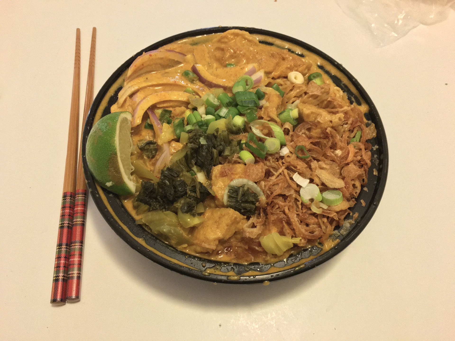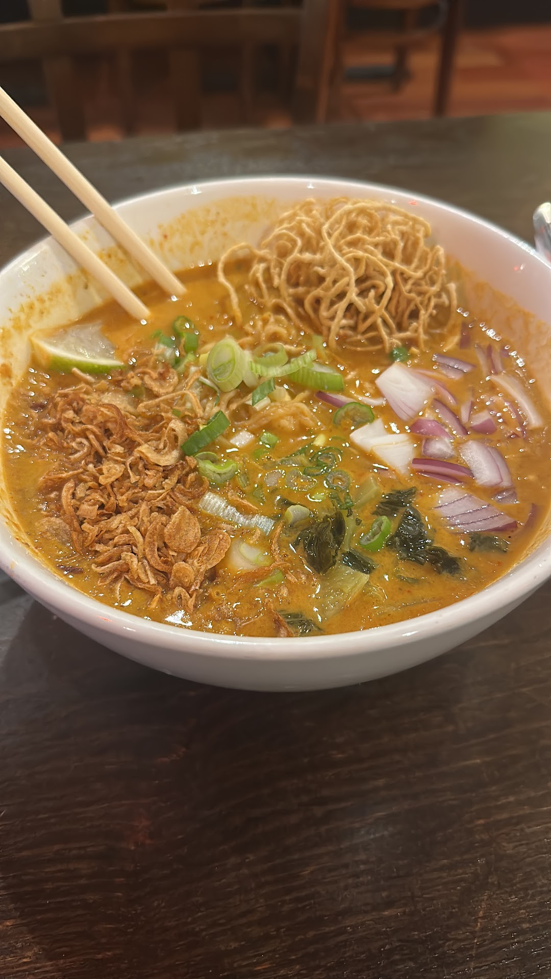 Read moreMainly ended up here because it was open late on Sunday, but it helped that the menu and everything I saw online looked promising, and it did not let me down. I at first was going to have my friend meet me to dine in, but then she had a change of plans so I had to change my order to go. They handled it well, and it was prepared pretty quickly. I got the Kao Soi Tofu and the Sweet Sticky Rice w/ Taro Custard. It was actually my first time trying both of these and I really liked them. The Kai Soi was like a dressed up yellow curry with a delicious rich and spicy sauce, which thankfully wasn't at all oily unlike some curries I've had. The pickled mustard greens were a really nice touch on this. The waitress asked if I wanted spicy or non-spicy and I went with spicy. Yes it is spicy but nothing insane. If you are averse to spicy food get the non-spicy version but don’t be afraid of the spicy if you have a moderate spicy tolerance. The sticky rice and custard was also delicious - the custard had such a nice texture and natural taro flavour, and the dessert wasn't too sweet or heavy. The portions were very filling but I was starving so I finished every last bite. Even in the takeout packaging, the presentation was really nice! Very fair prices for the size and quality of food! I also like the vibe of the restaurant, it's nothing fancy but the wooden walls make it feel cozy - would've loved to dine in and relax there...