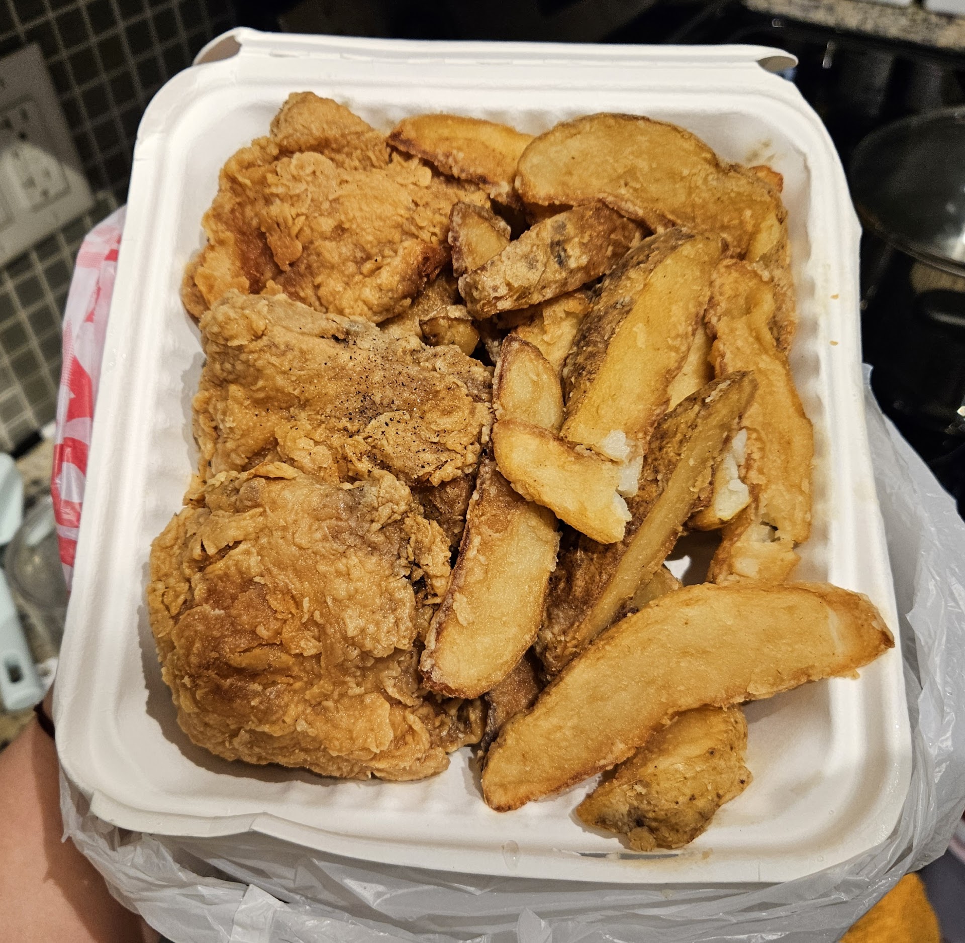 Upon further research, the fried chicken is pretty legit. I'm not gonna lie. It definitely gives Popeyes a run for it's money. The batter is slightly seasoned (thank God because I need more flavor than air dude) and it was very crispy. The fries on the other hand could've been decorative for what they added to the plate. Maybe it's because they were hot and built slight condensation in the bag, they were super soggy and sad. Some of the middle parts of the wedges even felt undercooked. More confusion.
