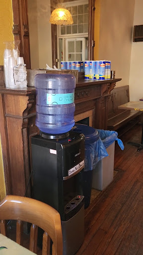 There's a window at top of stairs where you place your order. The menu changes daily and is listed on a chalkboard next to the window. The offerings are soup and sandwiches. Beverages are in a upright cooler where you can choose your own,