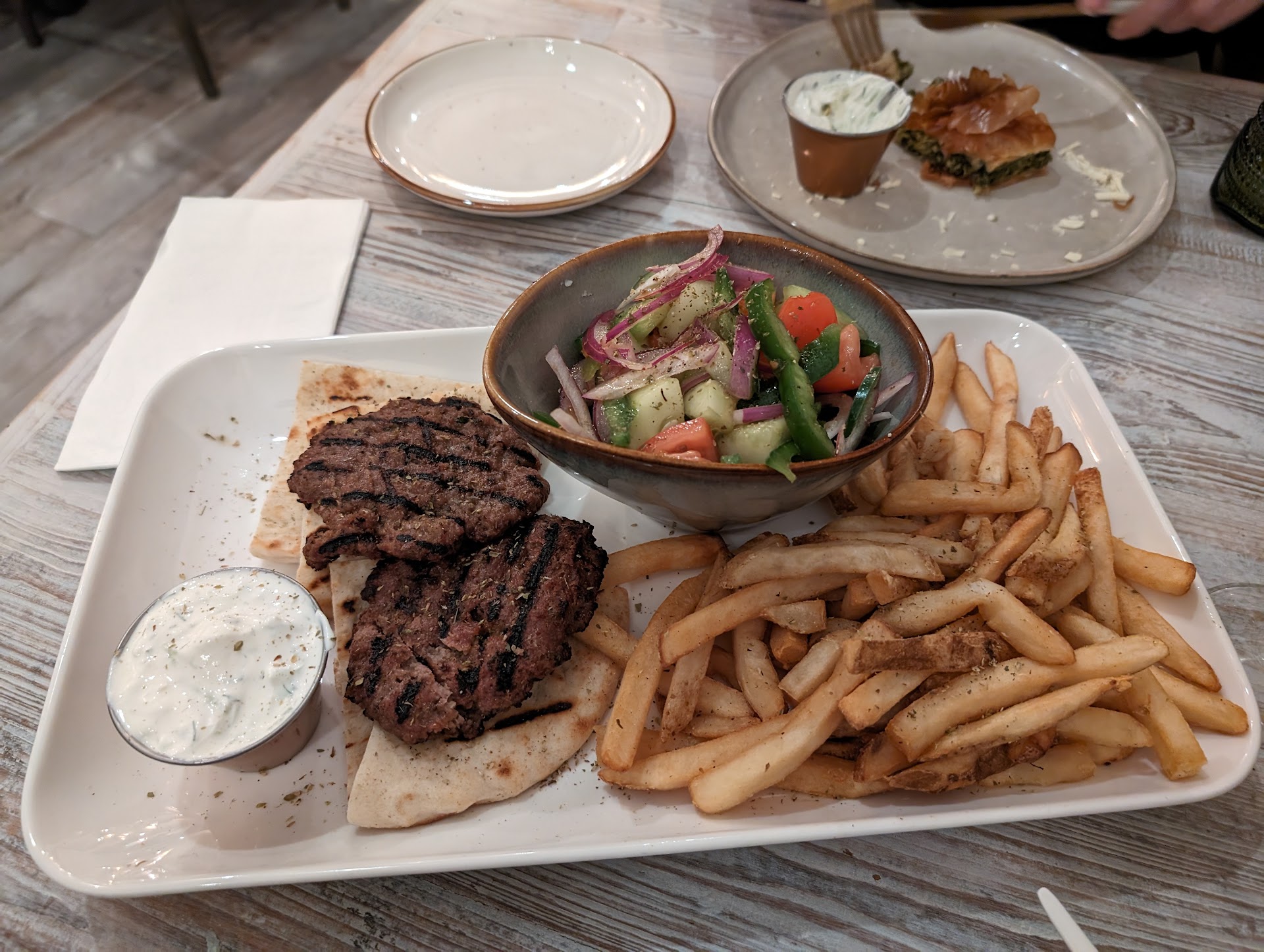 My wife ordered the spanakopita, an appetizer, as her main, and the waiter brought it out with our salad. My main course, the bifteki platter, wasn't brought out for another half hour so my wife ended up eating very slowly. Possibly a misunderstanding -- the platter ended up being too generously portioned for one person, so I suppose the waiter made a fair assumption that we were sharing that. So the timing was a little off. Souvlaki could save some money by decreasing the portion sizes of their platters, or reduce food waste by indicating on the menu that it's big enough for two.