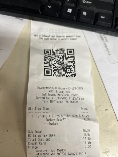 Read moreI come to this place often as I work nearby, went to get a ham egg and cheese 6inch. The lady working had no idea that that was a menu item. I explained several times and showed her on the app. She made it then up charged me for egg. I showed he how much it normally is and she could night find it on the os. I was in a rush so I couldn't even stay to be refunded the extra they charged me. Extremely...