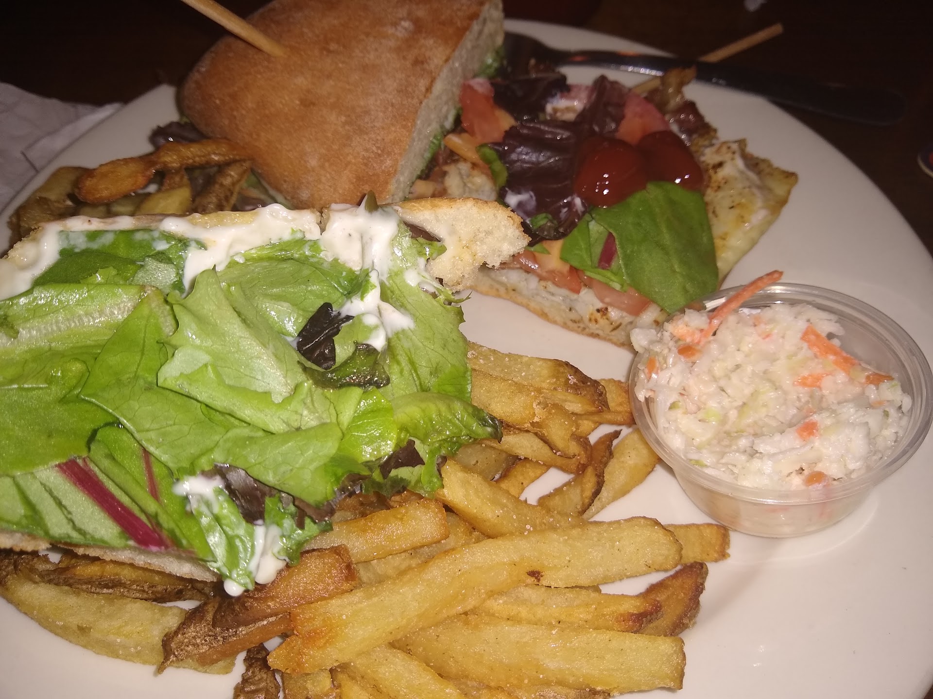 Food was gr8! Everything came very warm almost hot. Quality meal & ingredients. 1 of THE BEST Crabcakes in town: Seasoned & Broiled to Perfection. Nice & Moist, tender : DELICIOUS. Never had a cake seasoned (SO Flavorful) that way + nice amount of crab w/ minimal filler. Luv the crispy fries w/a bit of potato skin. Nothing was oversalted which is happening in far too many restaurants now.