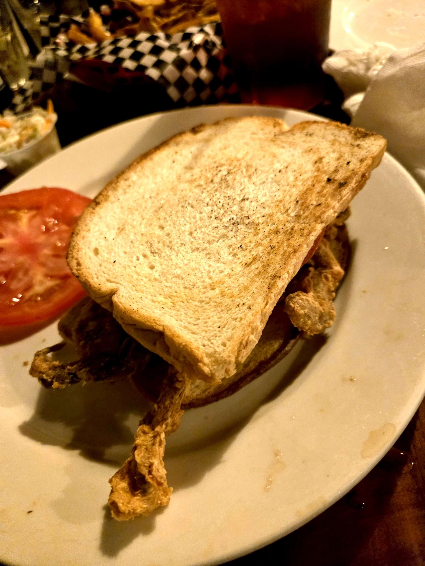 I had the soft-shell crab sandwich special (not on menu) which came on toast with mayo. I asked them to bring it on new bread, which they did without issue because I didn't know it came with mayo. A brioche roll would be a nice touch, but the sandwich was still delicious. The tomato slices were ripe, the pickle spear was good, and drink refills were timely.