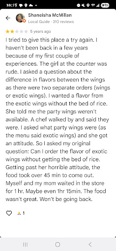 Salmon cooked to perfection ...PERFECTION...I had to ask who cooked this??? & HATS OFF!! Chicken Breast Strip thick and tender..no gristle! Lamb Chop fell off the bone and the jerk danced on ya tongue and went down smoothly.....ooooo Jesus!! I ate for 3 days!! & can we say GOOD ON THE REHEAT!!! You know you got good food when that reheat hits the same as when you 1st ate the meal if not better...Yeah... uh huh you know!! I ordered 4 meals as it was a celebration, my moms bday & we decided to go here last minute and we have not stop talking about the experience since and plotting return soon. Staff was Amazing....AMAZING...thank you Lovetta & Mama D!!! Awesome food Awesome service & they made mommies day!!! I AM IN LOVE WITH THIS PLACE AND CANNOT WAIT TO RETURN!