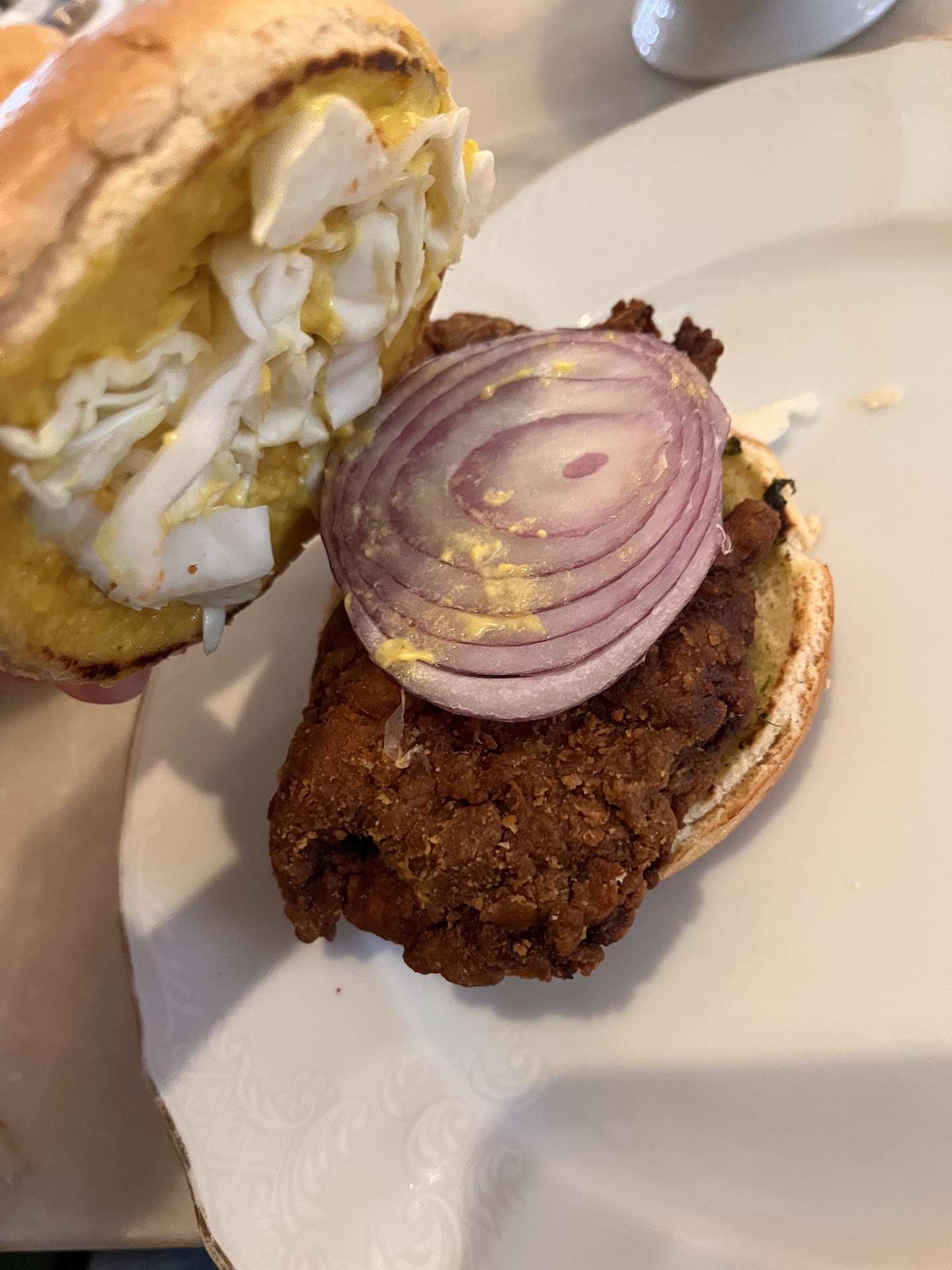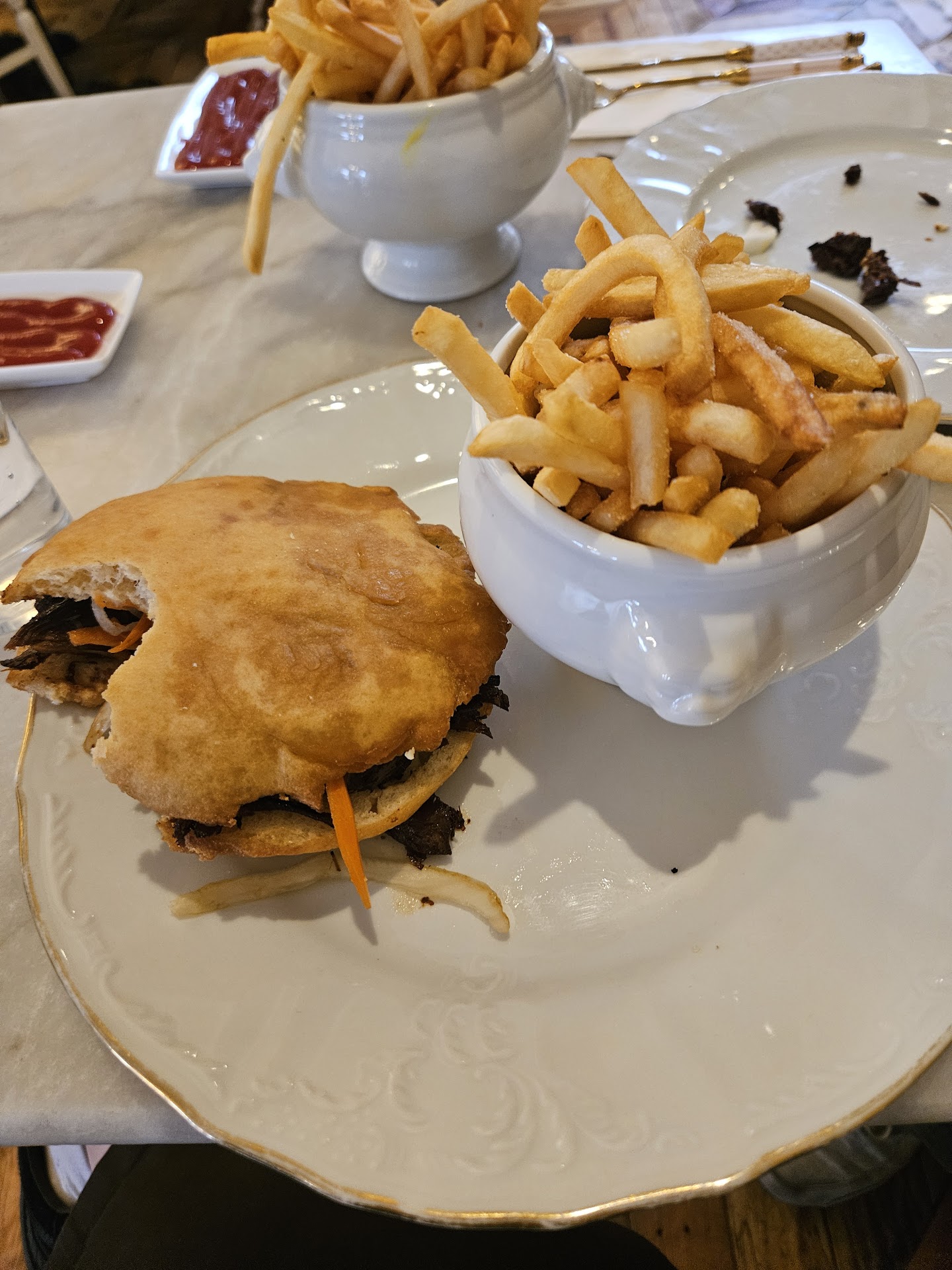 Really wanted to like this place but it was mid. The decor was beautiful, full of greenery and antique pieces - it's beautiful. We were admiring all the interior design choices. The music playing overhead sounded like a rendition of "chill lofi beats to study to" playlist, but it was fine. The washroom was not done, and the lock on the door was covered in masking tape and didn't work - luckily we were the only ones there so i didn't have to worry about being walked in on. My partner and I ordered the Tandoori Chicken Sandwich & the Porc Bokit for lunch. They were both dry as hell; the former being slightly burnt and the latter having basically no slaw and much substance. Really though, the pièce de resistance was the fact that both our fries that came with the sandwiches were literally McDonald's fries. I have spent my entire life growing up on those fries and ordering them at any chance I can get and the minute I saw those uniformly narrow cut, and pale-coloured fries I knew they were from McDs. As soon as we tasted them, we both had no doubt in our minds that they had served us reheated McDonald's fries (& during the boycott too!) Incredibly disappointing, and just aggressively mid. It is a shame that such a beautiful interior is being wasted on terrible and lousy food serviced by someone who doesn't seem to care all that much about professionalism and thus vaping inside the actual establishment. He was nice tho. Also, the actual prices were 10% more than they were listed...
