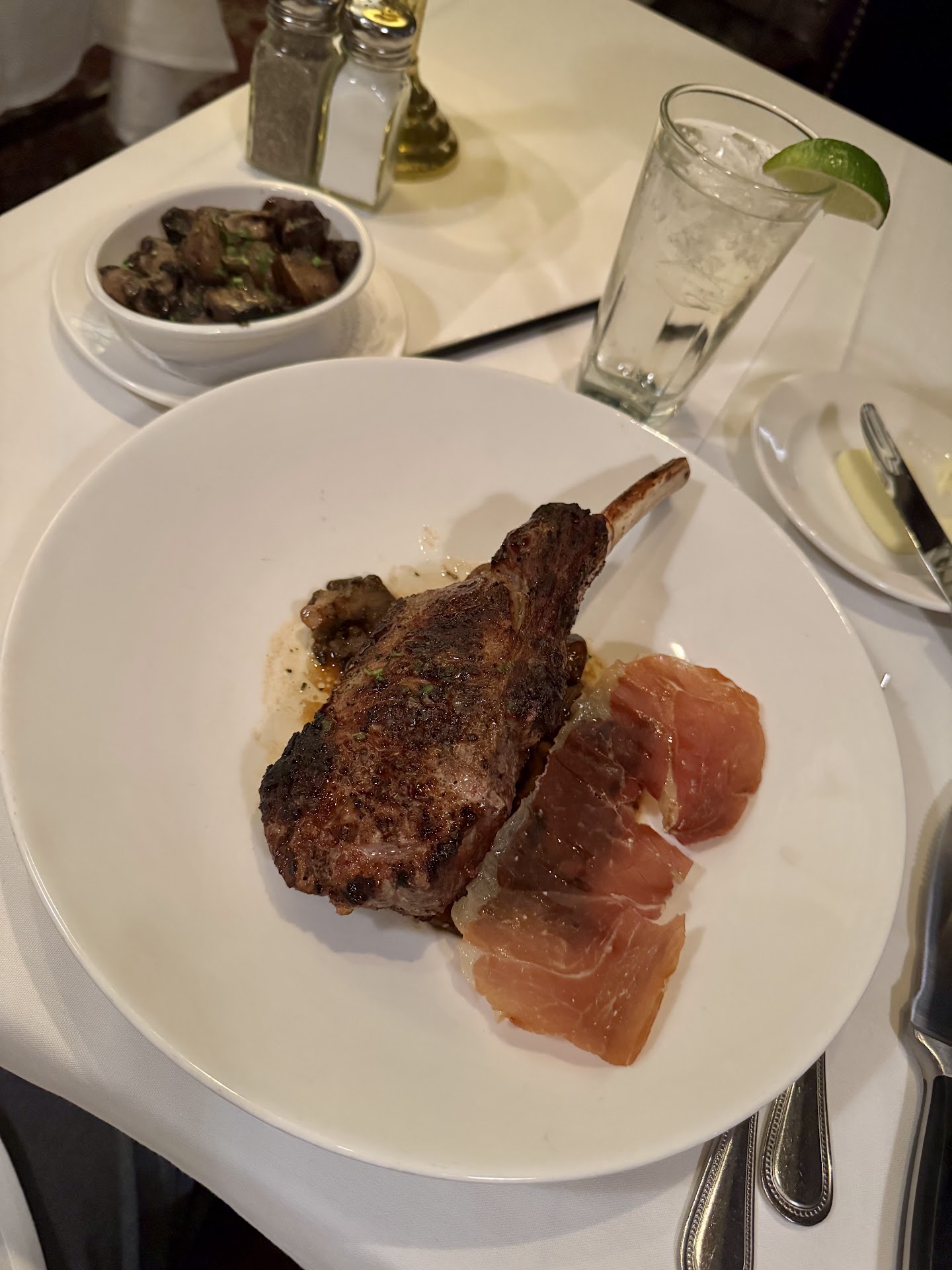 Read moreCame in after making my reservation same day for later that night on a Saturday, it was moderately busy. I missed the valet (which is just out front on the street, a valet box is right behind the sign just park there after turning left at the light) and I was about 7 mins late for my reservation but they still accommodated me. I did have to wait about 15 mins for the table to be ready but the general noise level was low enough I could speak comfortably with my date. Our maitre d' was very wonderful and knowledgeable. We were offered multiple specials and even had multiple questions answered. I ordered the Prosciutto with bread and harvest tomatoes appetizer. My first time having Prosciutto and it was very good. The bread did not want to cut but I didn't really want to eat it with my hands. For my entree I ordered the kona crusted steak with shallot sauce and my date had 2 filet mignon with 2 lobster tail in butter garlic sauce. I also ordered an asparagus that came with a lemon. It appropriately and as stated fed 2. I got 2 cocktails, the Stella dolli and the passion fruit mojito. Did not like the first as it tasted strongly of vodka but the mojito was fantastic after adding the lime. My date doesn't like mojitos and didn't care for the strength of the vodka either. For desert we shared a creme Brule with berries. I really enjoyed the blueberries and the creme Brule. Was also my first time having that and I will definitely get it again. Fast payment and return. When I went to show the valet my ticket my car was on the street at the light and I just had to run back to alert my date they already had it ready. All in all a great experience very tasty food. Good drinks. Delicious dessert. Friendly service and efficient. I wore a button up black and Grey plaid shirt with a nice pair of...