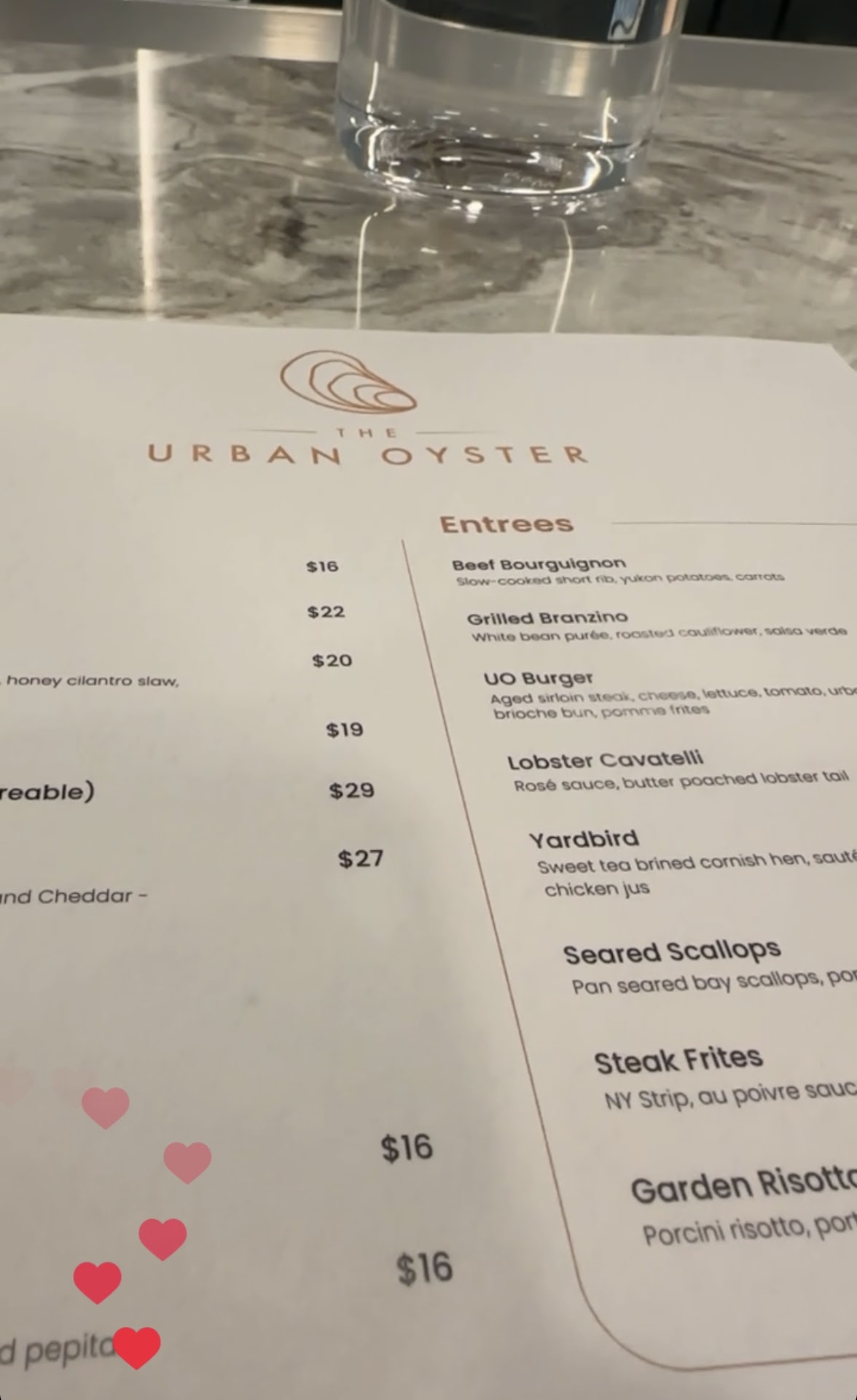 Our reservation was at 8, but the kitchen apparently closes at 8. Last seating should be 30min before kitchen closing. The result was us needing to order everything at once (what we were asked to do, and it wasnât a huge deal bc Iâm a Taurus and knew what i wanted weeks ago lmao), which felt rushed. It also meant that our food came out almost altogether, which meant a burger and steak and fries that were lukewarm. It wasnât enough to ruin the flavor tho, which to me is a testament to good flavors and good things happening in the kitchen. Iâm sure the pace of our orders had to do w the kitchen closing.