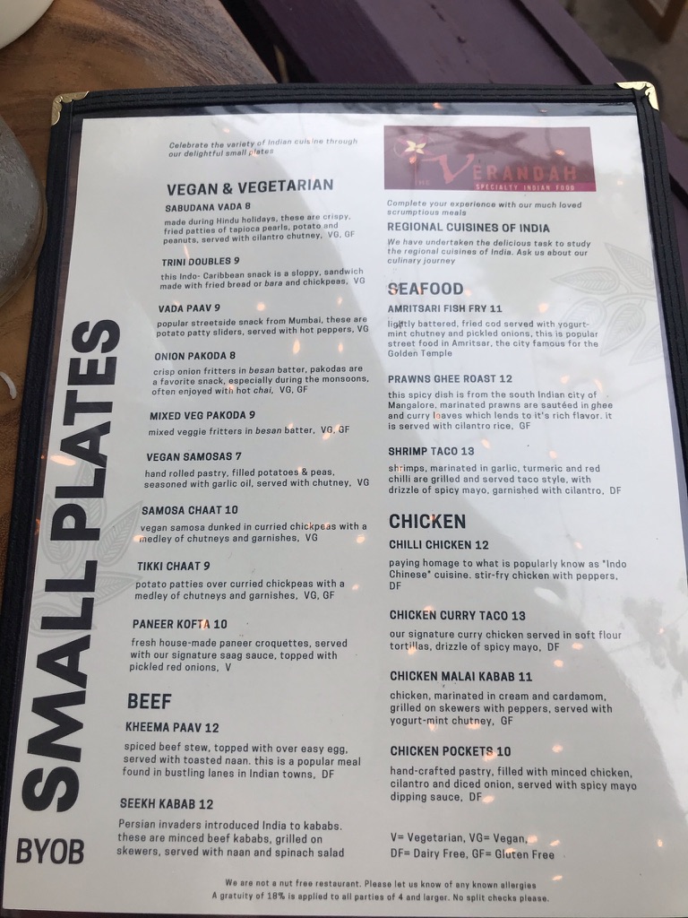 Read moreMy fiance and I dined here on a busy Sunday evening. We sat at one of the outdoor tables. I have absolutely nothing negative to say about The Verandah. Everything was absolutely marvelous. The cuisine was divine, and the family who runs the restaurant and serves the tables is extremely friendly and welcoming. We ordered six different small plates (which they specialize in), and each and every one was unique and delicious. We started with the paneer kofta and the samosa chaat -- both were among the best paneer and samosa dishes I've ever had the pleasure of eating. We then moved on to chilli chicken and amritsari fish fry, which completely blew our expectations for those dishes, and were extremely delicious. We rounded off with vada paav and kheema paav, which were also excellent, though beware that the vada paav is served with roasted serrano peppers which are extremely spicy! Every single dish blew our minds and were among the best indian cuisine we've ever eaten. The family is also extremely friendly and engaged us in memorable dialogue about the various menu items and their pleasure to cook and serve them. I would strongly recommend The Verandah, and we will most certainly be back (frequently). Also, it's BYOB, which is a really great bonus for a small sort of neighborhood...