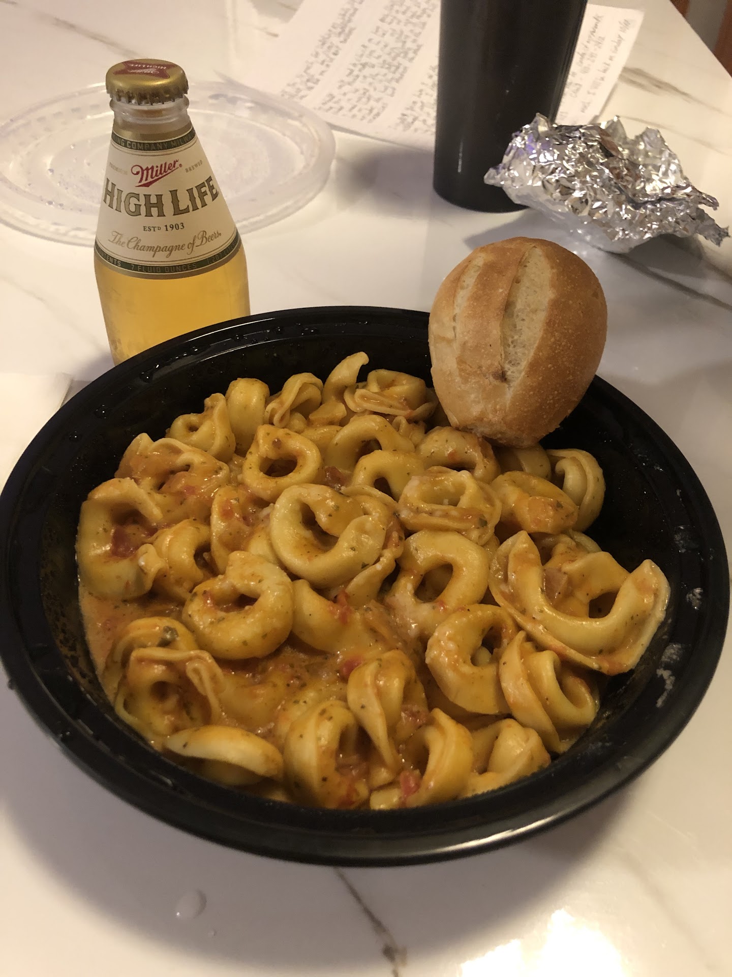 I ordered the tortellini tre salsa which is cheese ravioli in a mix of marinara, pesto, and Alfredo sauces. Upon getting home with my food, the first thing I noticed was how carefully it had been packaged. I donāt think Iāve ever noticed this with other places Iāve gotten carry out but the attention to detail definitely showed here. The second thing I noticed was the generous portion size. Weāre talking a large dinner plate size container. You can see this in the picture (7 oz beer for scale). The tortellini also came with a roll.