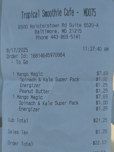 Today I ordered two Mango Magic smoothies ($7.69 each). I added the Spinach & Kale Super Pack ($1.00) to both and Peanut Butter ($1.29) to one of them. After tax, my total came to $22.53, which already felt a bit high, but I went ahead and paid.