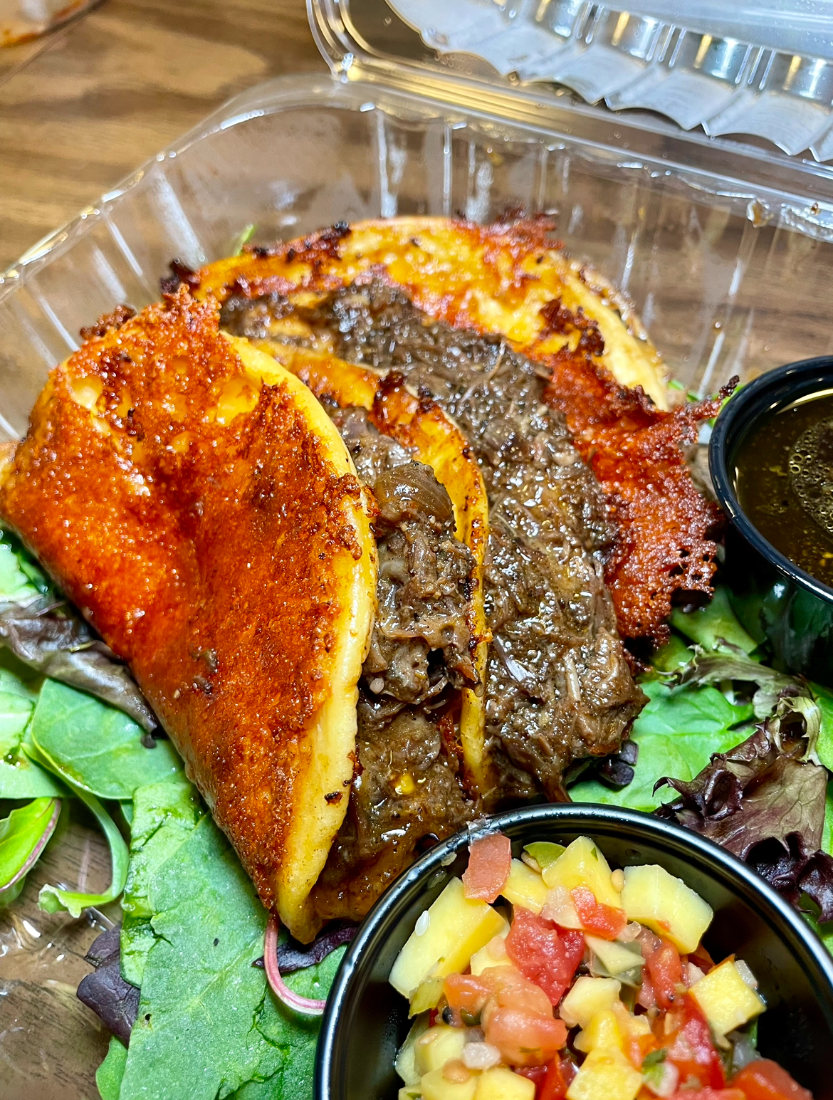 Their Oxtail Tacos (3 tacos with a house made mango pico de Gallo, & an oxtail consume $22). STAMP!! I love these better than Birria tacos!! Well seasoned, meaty, & savory!!