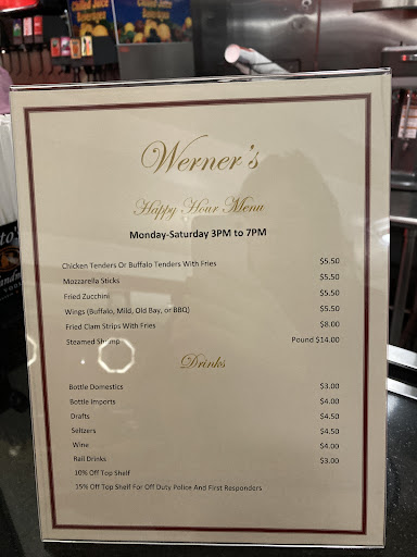 FURTHERMORE, I emphatically RECOMMEND Werner’s unbelievable steamed shrimp!!! NOW, it’s a happy hour special. I kind of wish it was a menu item for lunch although. Thanks to the owner (a couple weeks back), I was able to order some (HUGE) steamed shrimp (and fries). WHAT AN ABSOLUTE TREAT IT WAS! Perfectly seasoned, juicy, and the BEST steamed shrimp I have ever had. (see pic) Thanks again to the owner for allowing me this as a lunch...