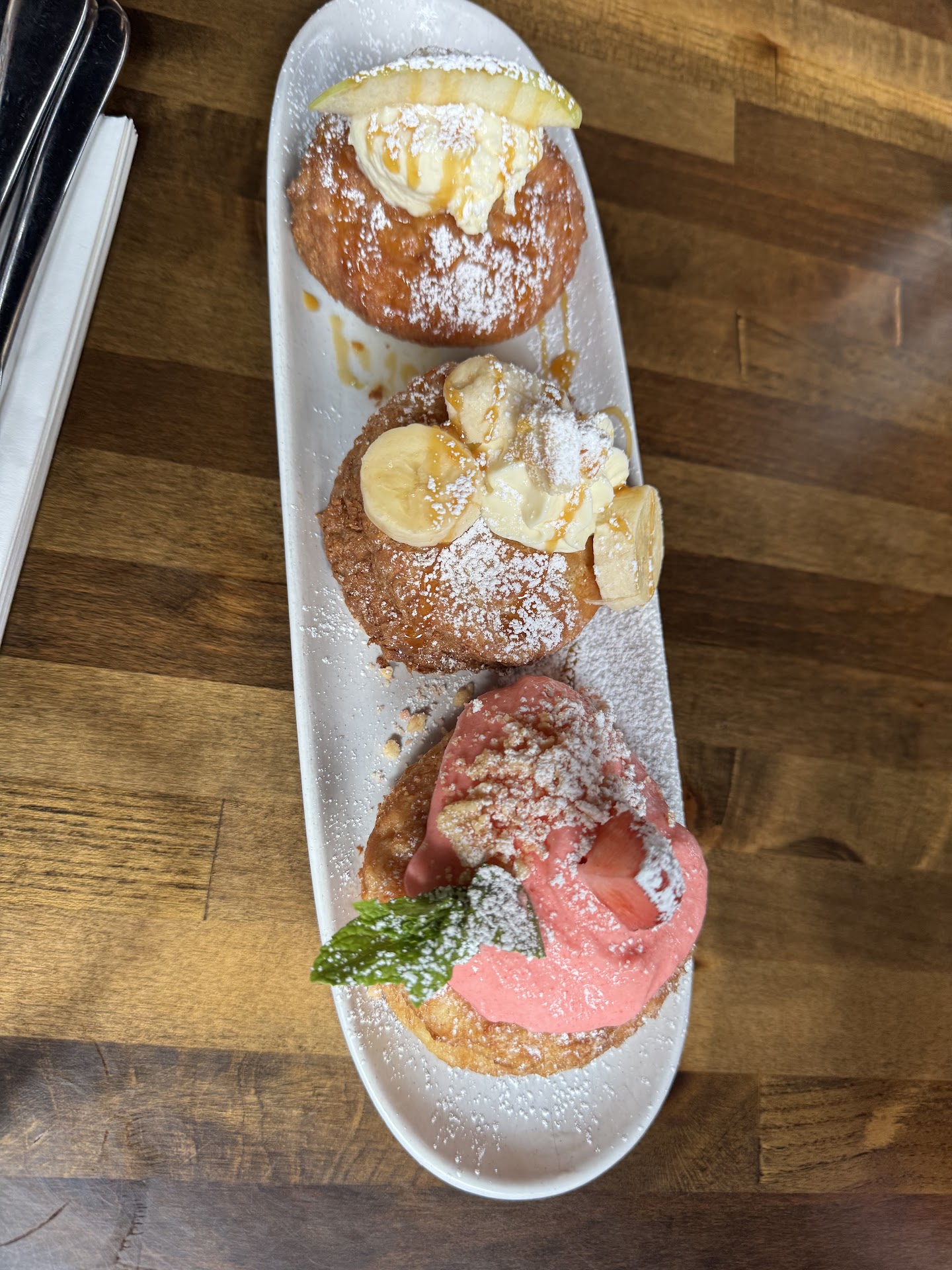 The biscuit flight was good. The fried biscuits were tasty. the salted caramel could caramel a little more, the banana pudding could banana a bit more, the strawberry was the best one.
