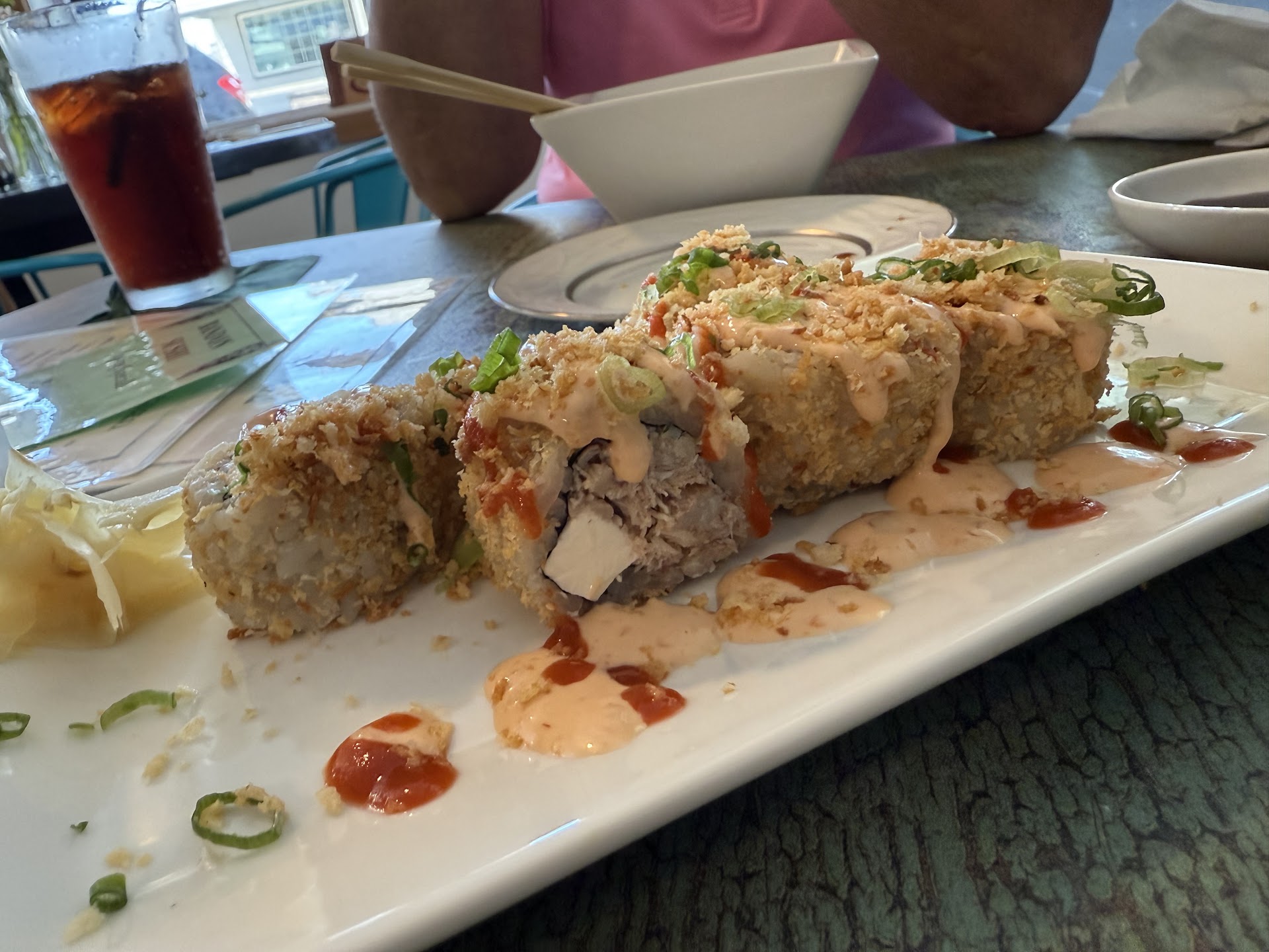 The edamame was tasty, and the rainbow roll was exceptional. The seasonal Pacific roll (I believe that was the name) ended up being our favorite. The Old Town Hamachi was solid, but the local seared albacore with house ponzu was spectacular. As a sweet surprise, they even gave us miso soup to go, which we enjoyed on our walk back to the hotel.