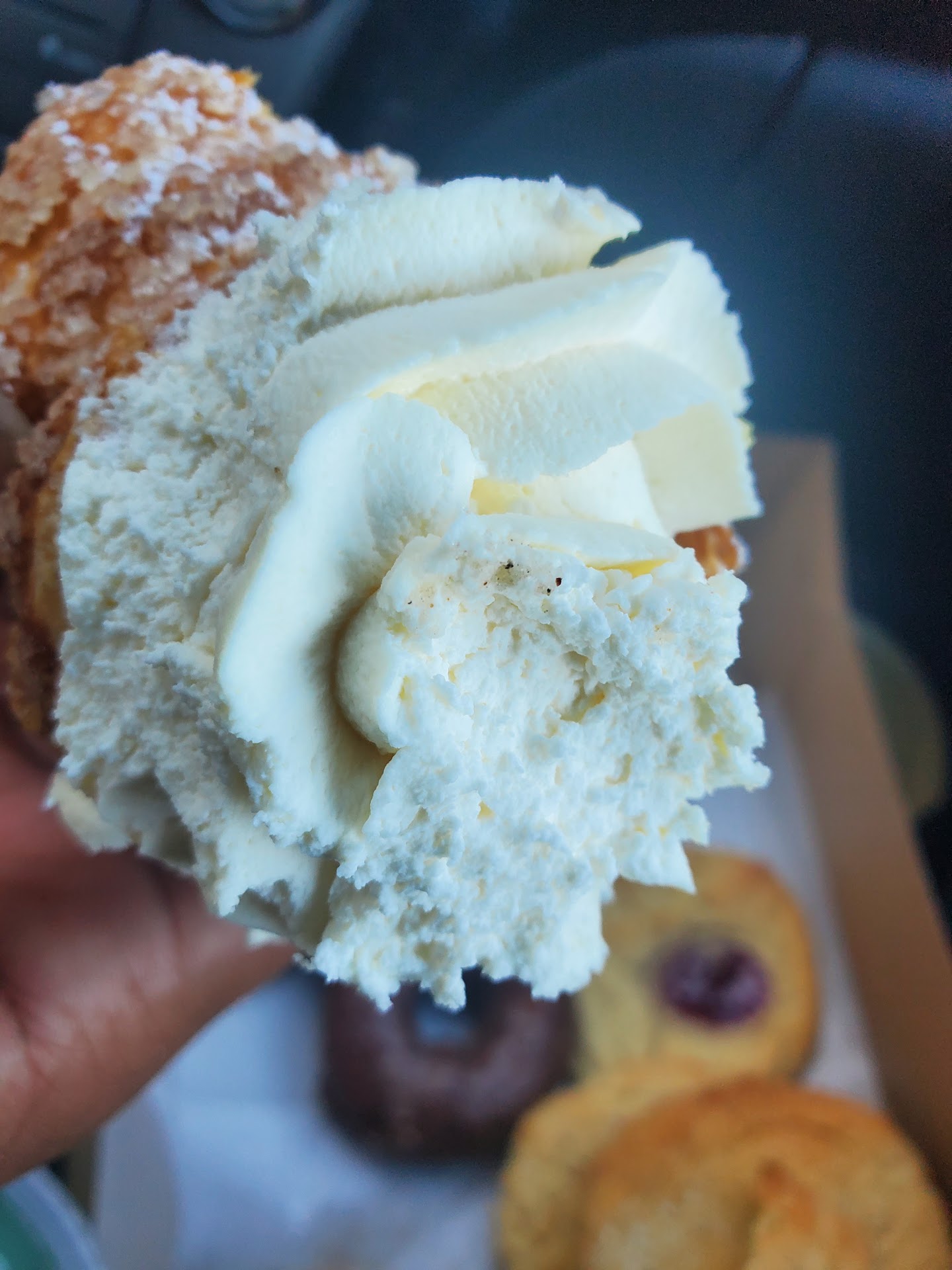 A pastry drama in two acts... Act I: My girlfriend and I visit Pastries and Pizza at 8:44 AM. Greeted by the bubbly, happy woman behind the counter, we place our order for a powdered sugar donut filled with lemon for my girlfriend, and two cakey donuts for me (maple frosted with chocolate sprinkles and chocolate frosted with chocolate sprinkles). We enjoyed the magic of Circles in the Sand for an hour and a half, which left us happy but cold from the constant wind on the beach... We retreated to our car to enjoy our treats (maple donut for me). Bliss.