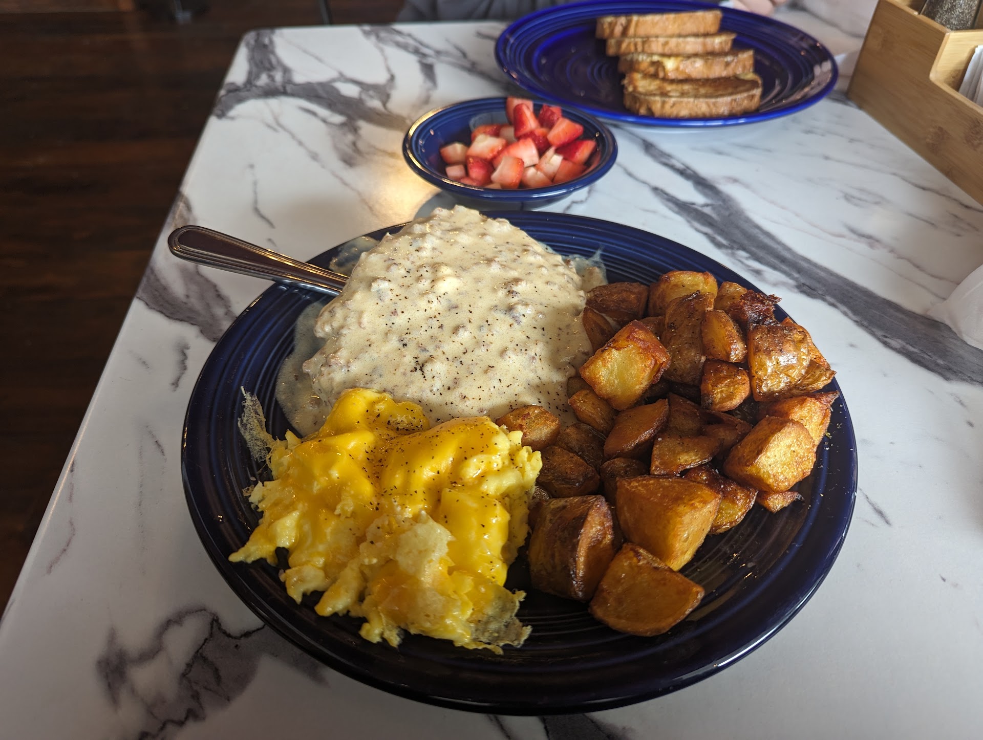 My daughter had the GF French toast plain with chopped strawberries on the side and she rates it (7/10) because it was bland but she admits it was her fault for asking for no...