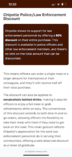 Read moreAs a State of Michigan Corrections Officer, I have dined at chipotle for years due to the great quality of food and the generous discount of 50% in which I have always received. I and many of my colleagues were thrilled when they opened a location in Bay City, Michigan, as this was close to our facility. I order from this location and the Saginaw location at least once a week due to the convenience, quality, and price tag! According to the chipotle website online, if an establishment offers the 50% off discount to police officers, they do to other law enforcement as well.