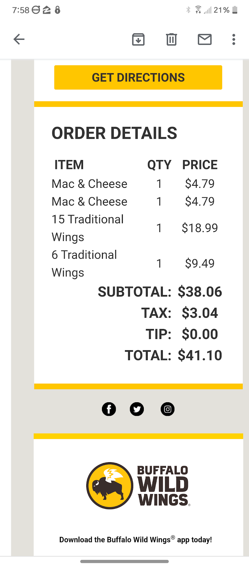 Dining in, unfortunately, isnât any better. On one occasion, my family met another family there for dinner. We ordered drinks and appetizers, only to be told after we were ready to place our entrĂ©e orders that they were out of chicken. At Buffalo Wild Wings. You can imagine our surprise. Why this wasnât mentioned when we were seated is beyond me.