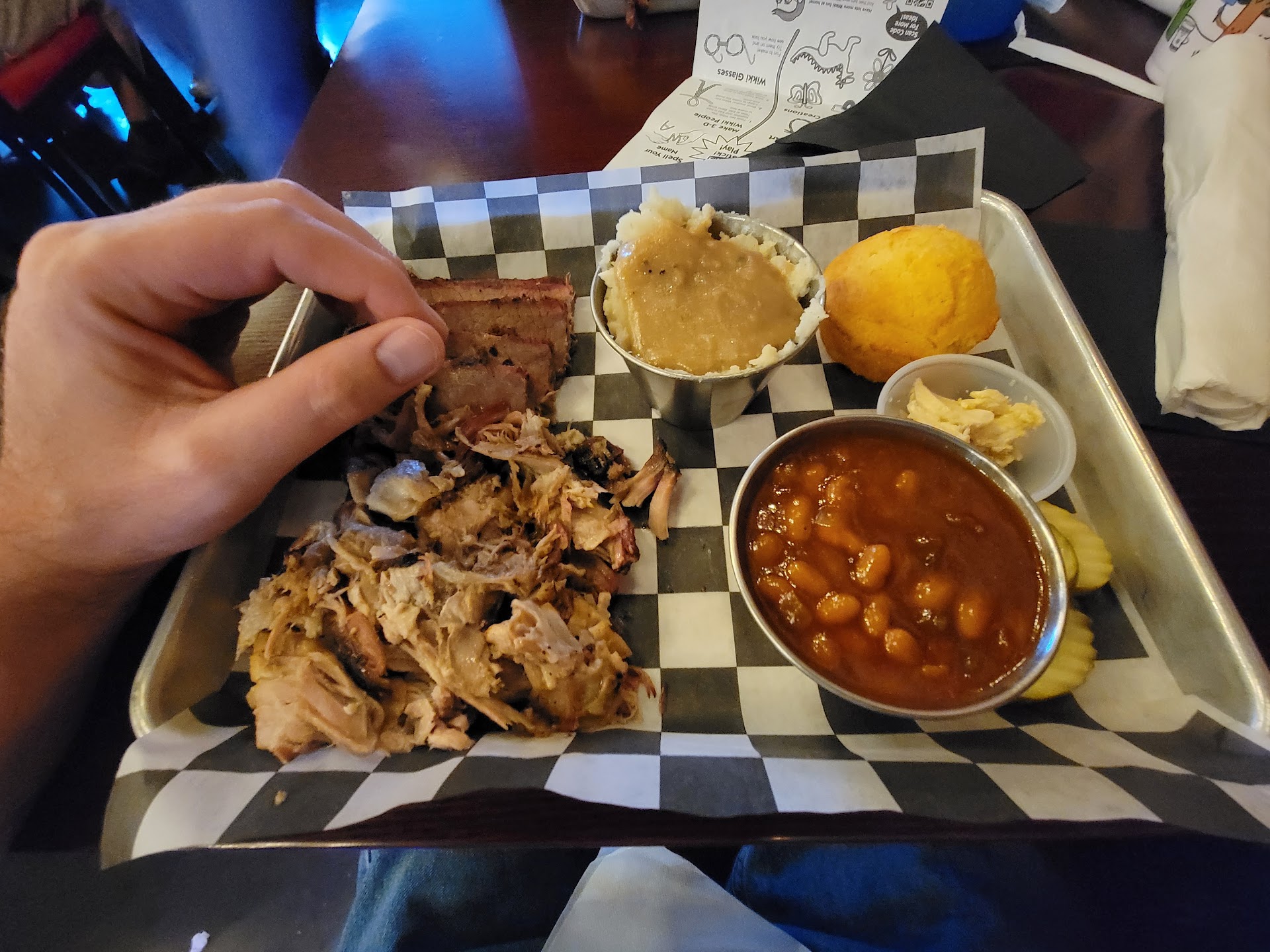 Read moreOur first time going here. It was okay. I'm not a brisket expert by any means. It just didn't seem flavourful at all. If it was smoked it really didn't taste like it. It was very dry but dipping it in the beans helped. Pulled pork fat didn't render down too well on the portion I received. I'd say it was 25% fat and it wasn't a very good texture to chew on. I question how long it was smoked. Potatoes were cold. The serving was small but really no smaller than Moe's. Beans tasted like Bush's grilling beans with jalapeños in it. Corn bread on par with Jiffy mix. $26 and I finished it easily. She got the brisket burger. The brisket was again, dry and flavorless. The bacon on the burger was rubbery and under-done. I took a bite of it and it just didn't work as a burger. Maybe if there was a beef patty and thin slices of brisket atop it might work. It just balled up in your mouth. The burger my son got off the kids menu was very good. Our daughter had the half portion of pulled pork. She received a very good portion of meat and fries. I'd consider the kids menu as an adult. I tried the fries and they were very good. Possibly one of the best fries in Bangor.