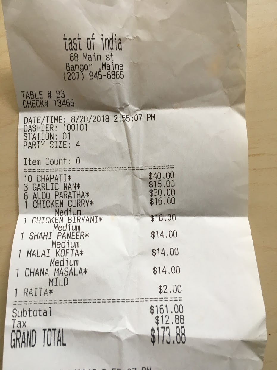 Food: 1 star ala/malai kofta/paneer curry/chicken curry) were all made from the same gravy(sauce). Naan was ok, but the roti and Parata were not at all well cooked. Size of the serving was medium at best. We were asked whether we need onions/tomatoes/peppers in chicken Biryani or just chicken. I had never heard someone throw this question when asked for a Biryani (coming from a guy who is from Southern India from where Biryani has its origin).