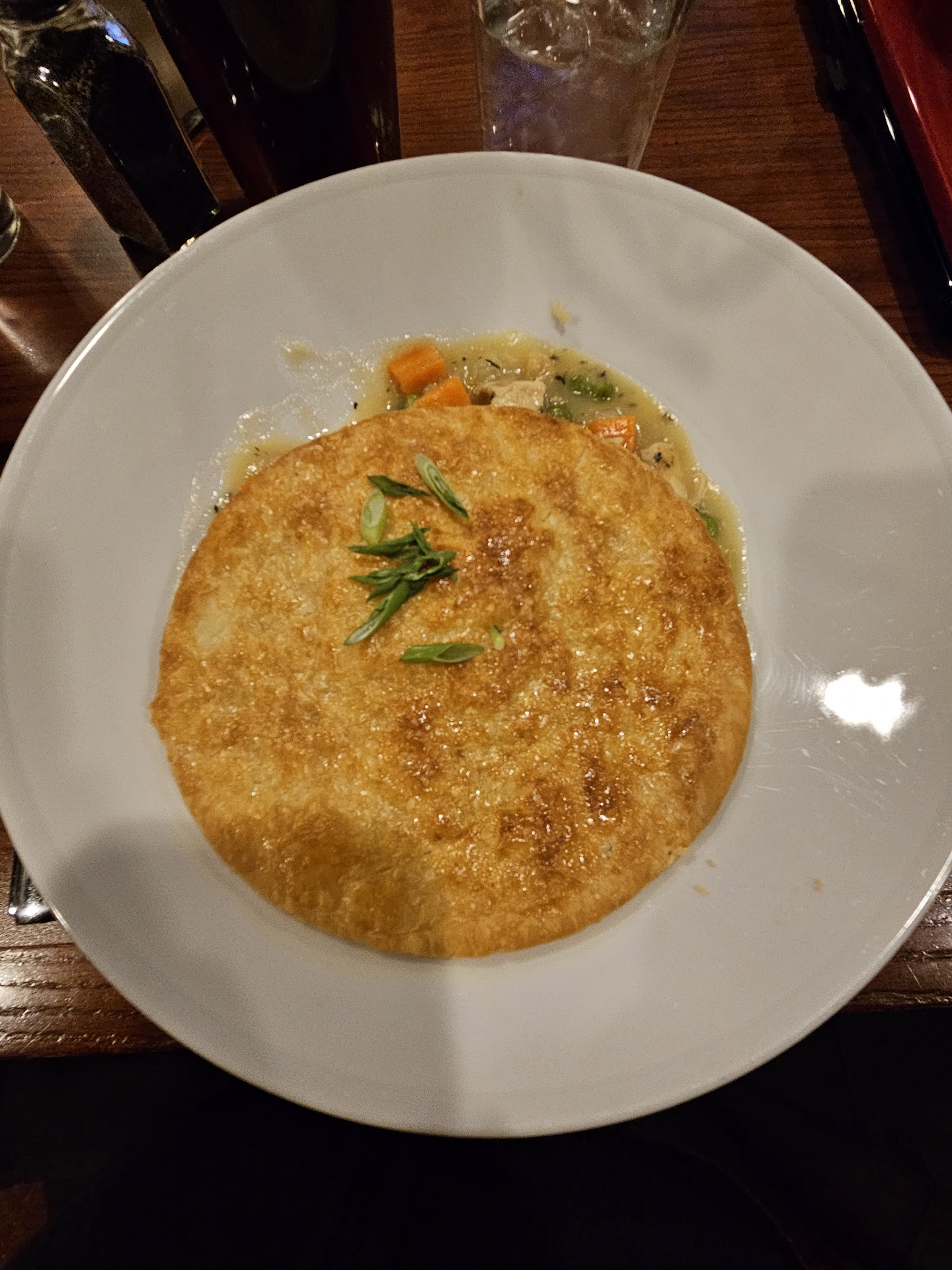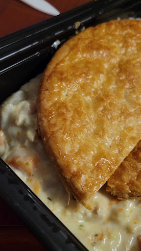 Now, The special entree was great! I had the chicken pot pie. The pastry top was flaky and good. My party got there at 5:18. Despite us and only 1 other party being in the dining room...We were told that we ordered the last two! This was really great and I am sorry other patrons missed out. It was piping hot with potato, Mashed Potatoes smeared to adhere the pastry, carrots, peas, chicken (very little). Plating was messy. I give it a A- but because of the pastry. The filling was a B. Again, the staff made the atmosphere by...