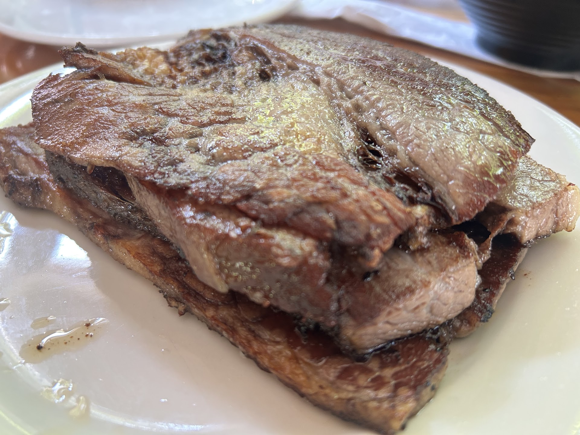 First up I always sample the sides and the beans looked delicious with some jalapenos and sausage chunks. I found the beans to be quite delicious...very well done! Next was the potato salad which was a substantial letdown. It appeared to be mustard based due to the yellow color, but upon sampling it had no taste. No mustard, no salt, no redeeming qualities. Even my wife who is satisfied by minimal seasoning said it was super bland...did not finish. Liked the cornbread and really enjoyed combining it with the beans.