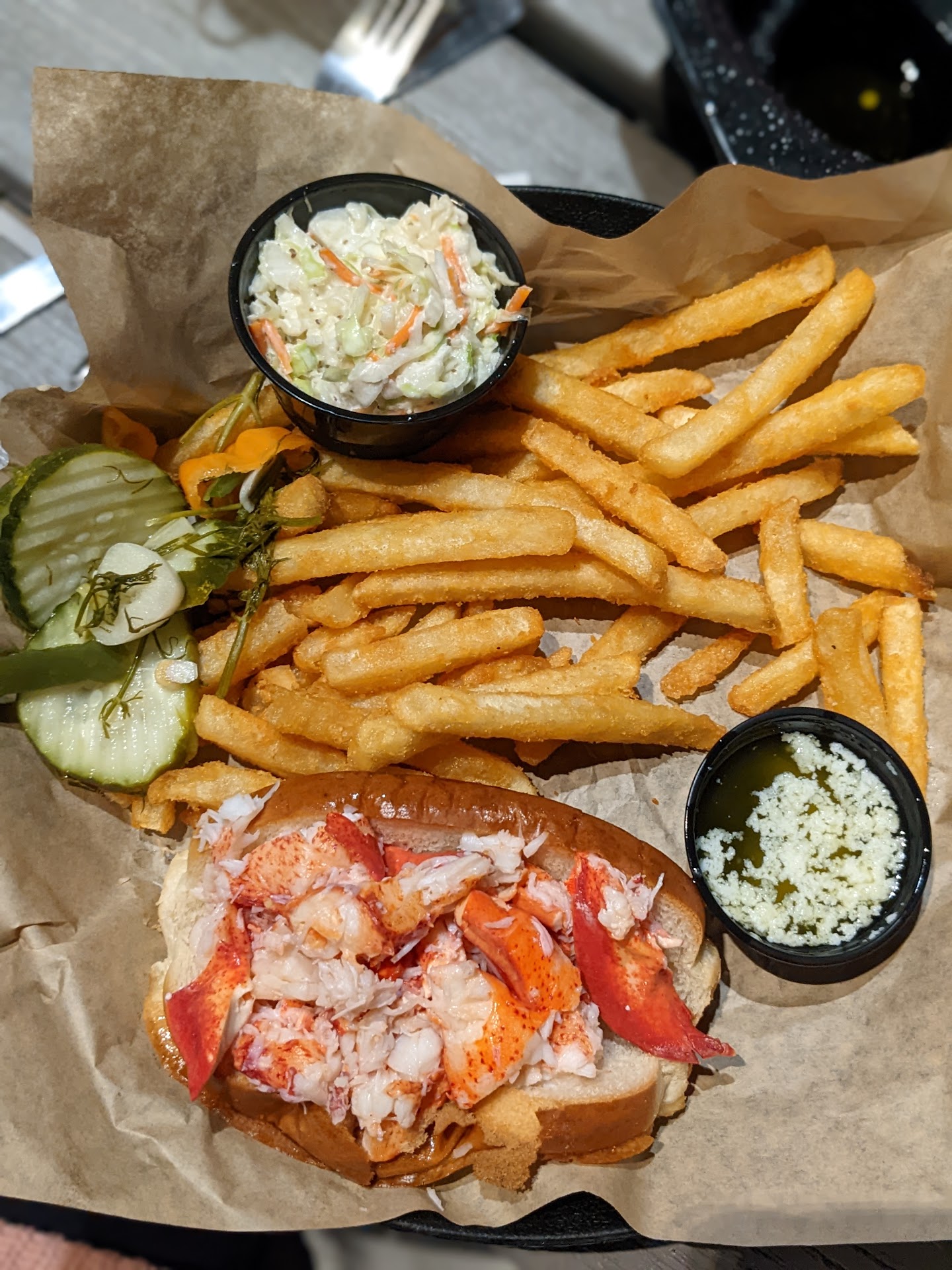 Pros: I'm not going to sell you this is the best lobster roll for your money in Bar Harbor, because I've not tried every place in Bar Harbor. But I can promise you it's going to be fresh, a good portion, and the price is fair. There are reviews scoffing at the price of the lobster roll, but those people are unaware of the market price of lobster. Beware of $20-$25 lobster rolls at other places, because you will be sacrificing the size of your roll and it's not worth it. Get a good roll, overflowing and cooked perfectly so you're full of Lobster and not regrets. There are a handful of restaurants in Bar Harbor that have been there for over 20 years for a reason, and Stewman's is one of them. Any hoot, the roll is ever so lightly toasted, buttered, and won't cut up your mouth or collapse upon lifting. The lobster is served cool with an unnoticeable amount of mayo on it. You are provided hot butter to slowly glaze the juicy crustation and in essence warm up the lobster just enough to enjoy the sweetest cold water Maine lobster that is only attainable this far north. It's perfect. I hate mayo and cold lobster meat, but the quality of meat, warm butter, and perfectly cooking technique (very easy to overcook and create rubber) is the winning combo for me. Fries, pickles, damn good housemade slaw was just enough.