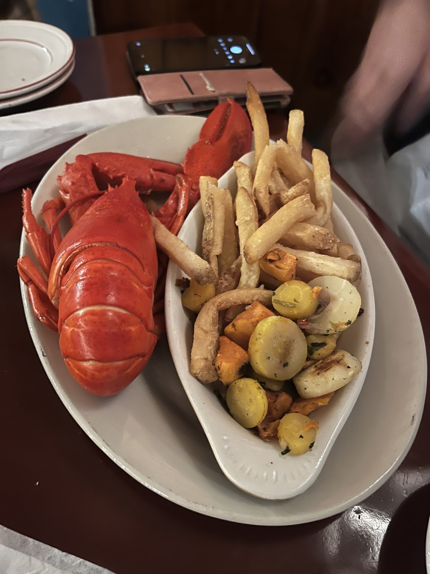 Read moreI left this restaurant with a sense of disappointment. We finally decided to have some local lobster and here are all of my honest remarks. Although we were there during Happy Hour and it seemed like a good idea to take advantage of the reduced oysters' pricing, it apparently applied to the bar and the outside area only. Well, we ended up eating a smaller portion, and the oysters were fresh and tasty. We also shared Crab Cakes appetizer that my wife enjoyed and I thought of being a mix of gooey "stuff" that lacked a crispy crust and a pronounced crab taste. Well, let's get to the lobster part. The restaurant offered quite a few options: the traditional whole lobster, Lazy Lobster (out of shell, sautéed in garlic butter), and Newburgh (in cream sauce). The sides were limited to fries, baked potato or rice. My wife ordered the Lazy Lobster and I asked whether it were possible to have the same dish served over pasta. Our very friendly and well spoken waitress recommended Lobster Carbonara pasta being what I'd enjoy, which I agreed to. While my wife's dish was as expected, mine constituted a plate of a flavorless "cream soup" with linguini with lots of peas and very little lobster or flavor to speak of. It was neither a Carbonara sauce nor could it be called a Lobster Pasta. Do not order it. Period. The waitress was nice to remove this dish from our check, but she should have not recommended it in the first place (hence 4 stars for service). We then decided to give another Maine staple a try, a Blueberry Pie. The crust was clearly salty, the filling seemed to consist of blueberries mixed with something like a jam and the fresh cut up strawberries in whipped cream still had their green stems attached (seriously?). The double espresso was served in a single espresso cup and was overflowing it, but tasted good. Call me picky, but I would not return to the restaurant where so little attention is paid to any essential details. Maybe kids and pets would have a better chance of liking it? It was the first ever menu featuring Kid-friendly cocktails and an Pets-section...