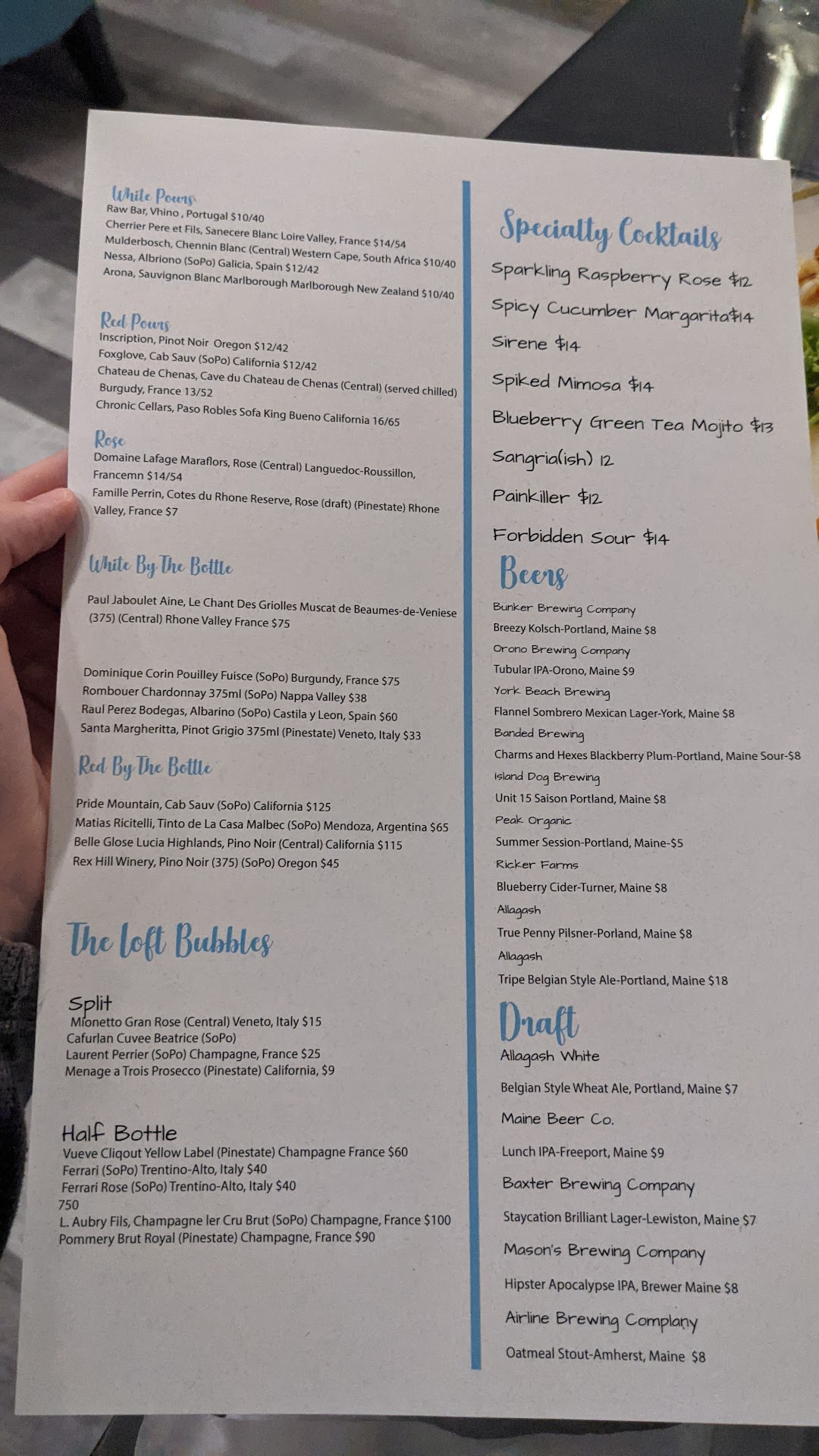 Read moreI'm writing this review after dining at The Loft on it's opening night. I believe that this restaurant has absolutely amazing food, fantastic service, an excellent bar, and a great location in Bar Harbor. The Loft does not have a traditional menu, rather they have a great selection of oysters, a raw bar, and shareable platters. There is a selection of "meals" on the menu, but the options there are limited. What The Loft instead offers are shareable platters for couples or groups. The format is more like tapas, but bolder.