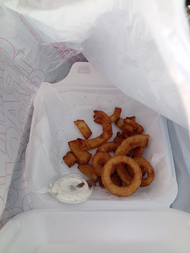 Usually this place is known for its onion rings and ranch which is usually exceptional well I called 20 minutes ahead yesterday to order onion rings and ranch I get there ask for a glass of water too she hands me out the bag I paid her I go around I feel the bags kind of light so I'm like oh there's no ranch in it I asked my son is a ranch he opens and he said no no ranch so I go back in and I wait 15 minutes for some ranch.... Only to come out start to drive off cuz I was on my way somewhere open up my onion rings and see this.... Needless to say I won't be going there for a while again you can do better I'm so...