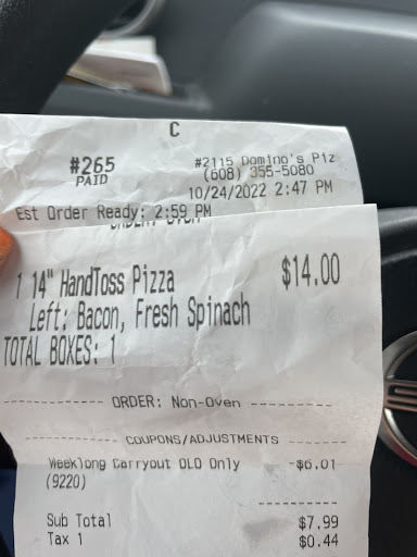 Read moreMy husband and I visited the Dominoes in Baraboo while we were on vacation. We placed an order for carryout online and attempted to use their pickup window. The online updates indicated that our order was ready, and it had already been paid for, but we still had to wait an additional 25 minutes after the order was finished and ready to be picked up because we were in a long line at their pickup window. We tried to go inside; the door was locked. We tried to call; they put us on hold. When we finally got to the window they didn't give us the drinks we had paid for and seemed surprised when we asked for them, and we had to ask for a bag to carry the extra bottles of soda we had ordered.